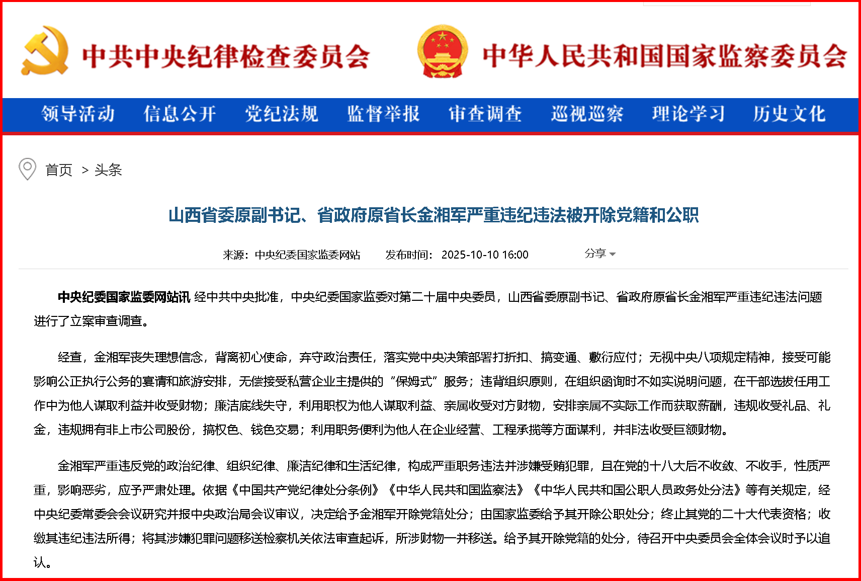 新華社北京10月10日電 經(jīng)中共中央批準(zhǔn),中央紀(jì)委國(guó)家監(jiān)委對(duì)第二十屆中央委員,山西省委原副書(shū)記、省政府原省長(zhǎng)金湘軍嚴(yán)重違紀(jì)違法問(wèn)題進(jìn)行了立案審查調(diào)查。