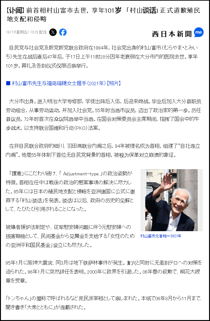 新華社北京10月17日電(記者溫馨、袁睿)日本前首相村山富市17日去世,享年101歲。外交部發(fā)言人林劍在當(dāng)日例行記者會上表示,中方對村山富市前首相逝世表示沉痛哀悼,向家屬致以誠摯慰問。村山富市先生為促進中日友好事業(yè)所作出的貢獻將被永遠銘記。
