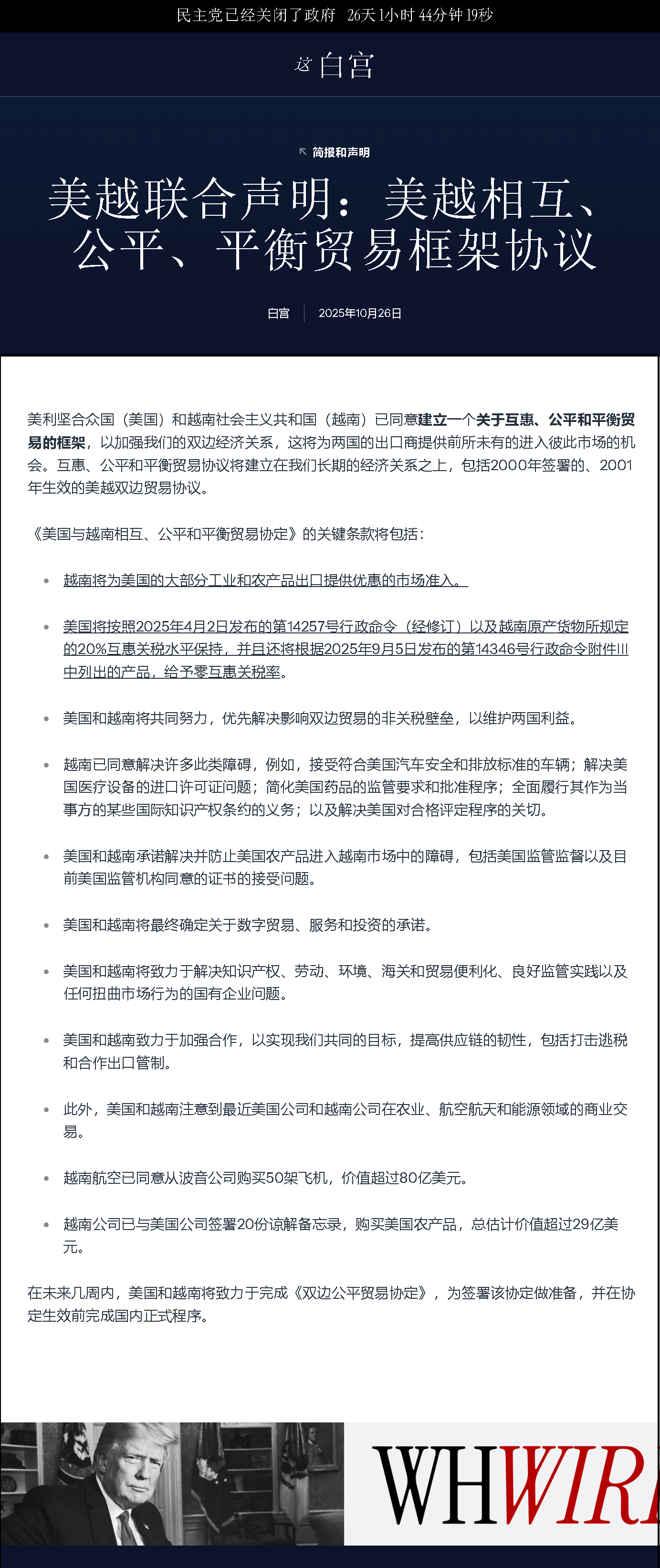 在中美兩國正在進行經貿談判之際,越南的突然出手引發(fā)了各方關注。10月26日,越南與美國聯(lián)合發(fā)表聲明,宣布達成了一項重要的經貿協(xié)議框架,其中涉及對中國及其他國家的轉口貿易問題。這一舉動的背后,究竟隱藏著怎樣的戰(zhàn)略意圖?