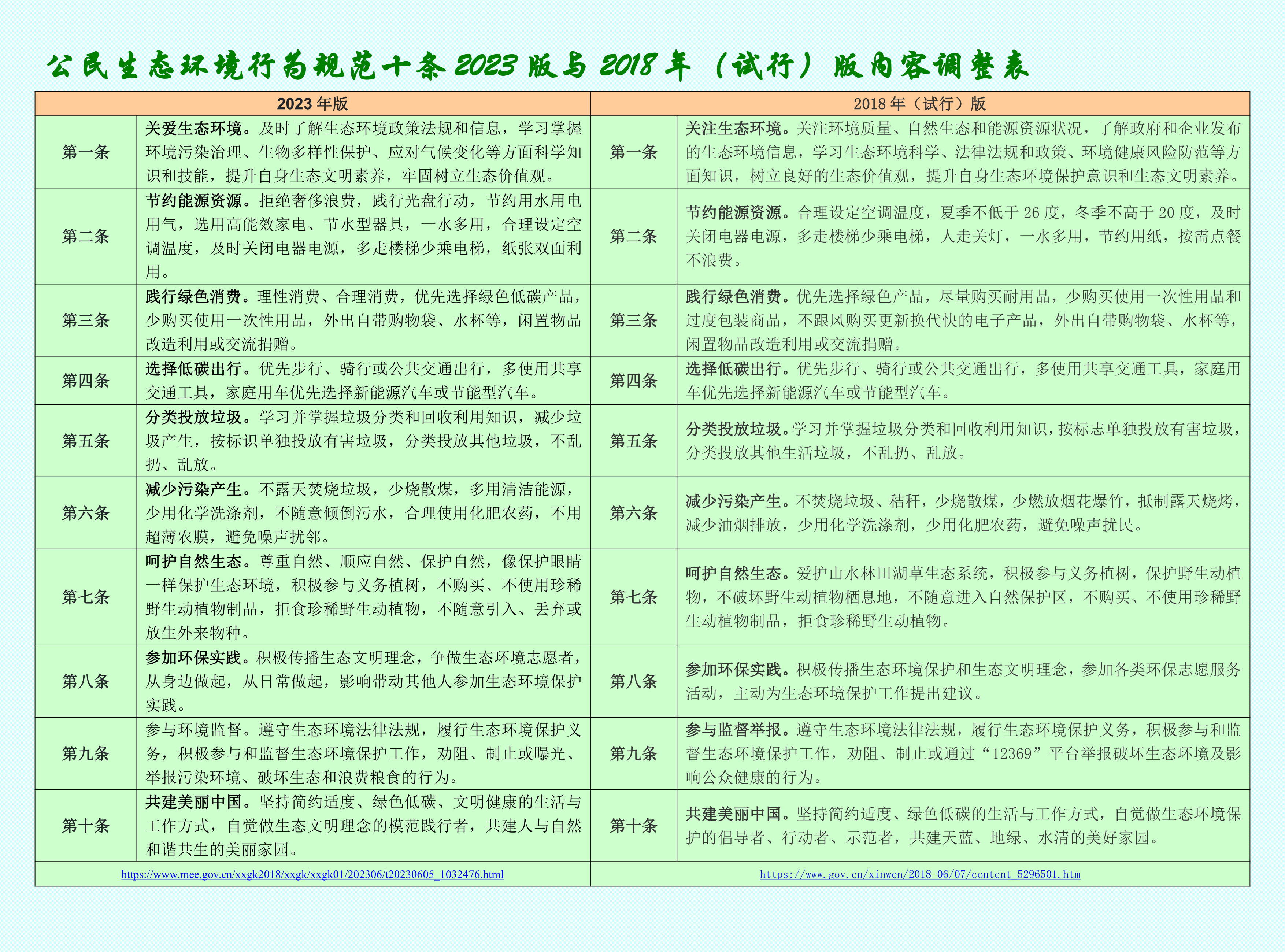新修訂的《公民生態(tài)環(huán)境行為規(guī)范十條》包括關愛生態(tài)環(huán)境、節(jié)約能源資源、踐行綠色消費、選擇低碳出行、分類投放垃圾、減少污染產(chǎn)生、呵護自然生態(tài)、參加環(huán)保實踐、參與環(huán)境監(jiān)督、共建美麗中國等十條內(nèi)容。