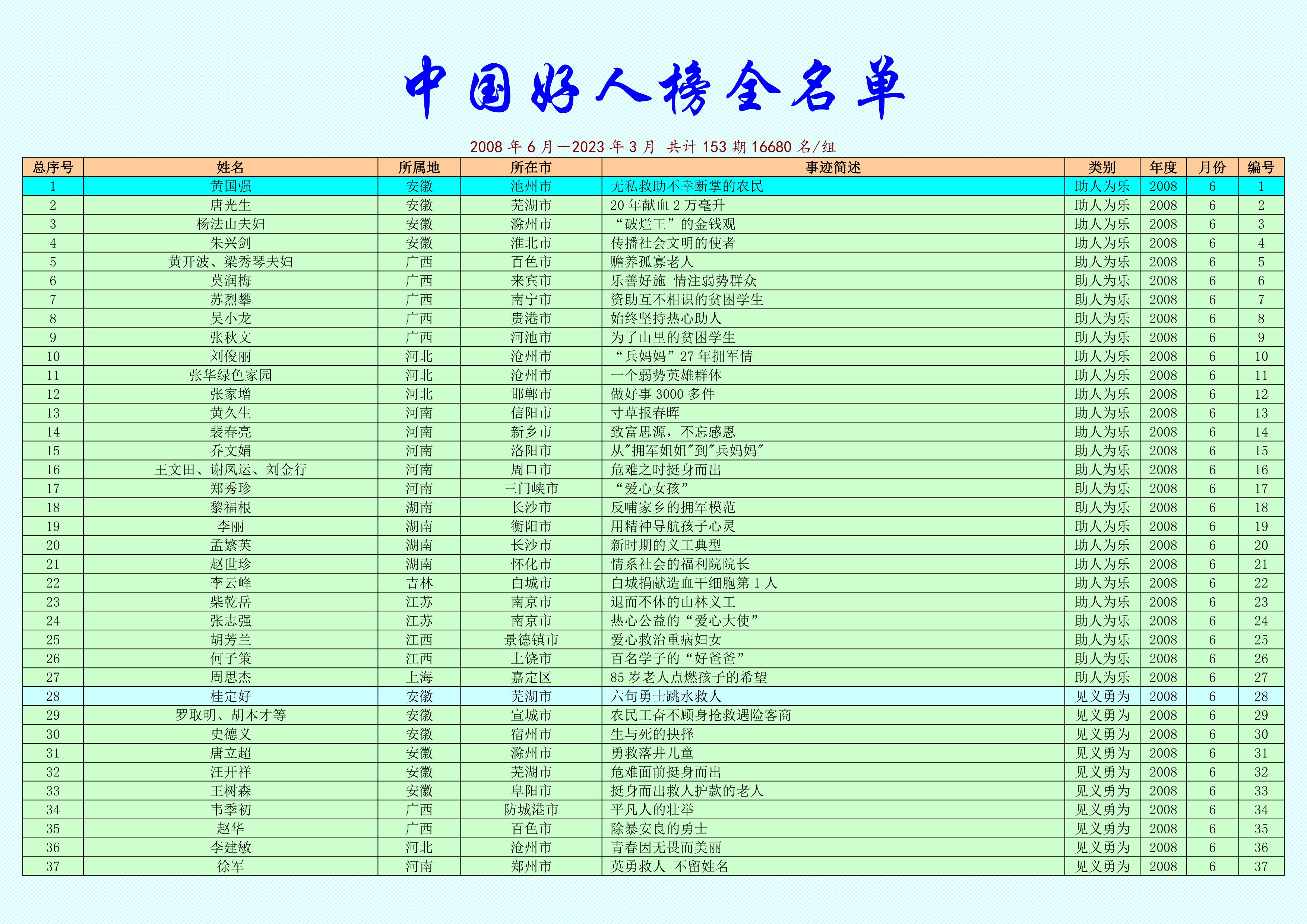 新華社鄭州6月21日電(記者韓朝陽(yáng))6月21日,2023年第一季度“中國(guó)好人榜”發(fā)布儀式暨全國(guó)道德模范與身邊好人現(xiàn)場(chǎng)交流活動(dòng)在河南省洛陽(yáng)市舉辦。經(jīng)各地推薦、網(wǎng)友點(diǎn)贊評(píng)議和專家評(píng)審等環(huán)節(jié),共有150人(組)助人為樂(lè)、見(jiàn)義勇為、誠(chéng)實(shí)守信、敬業(yè)奉獻(xiàn)、孝老愛(ài)親身邊好人光榮上榜。