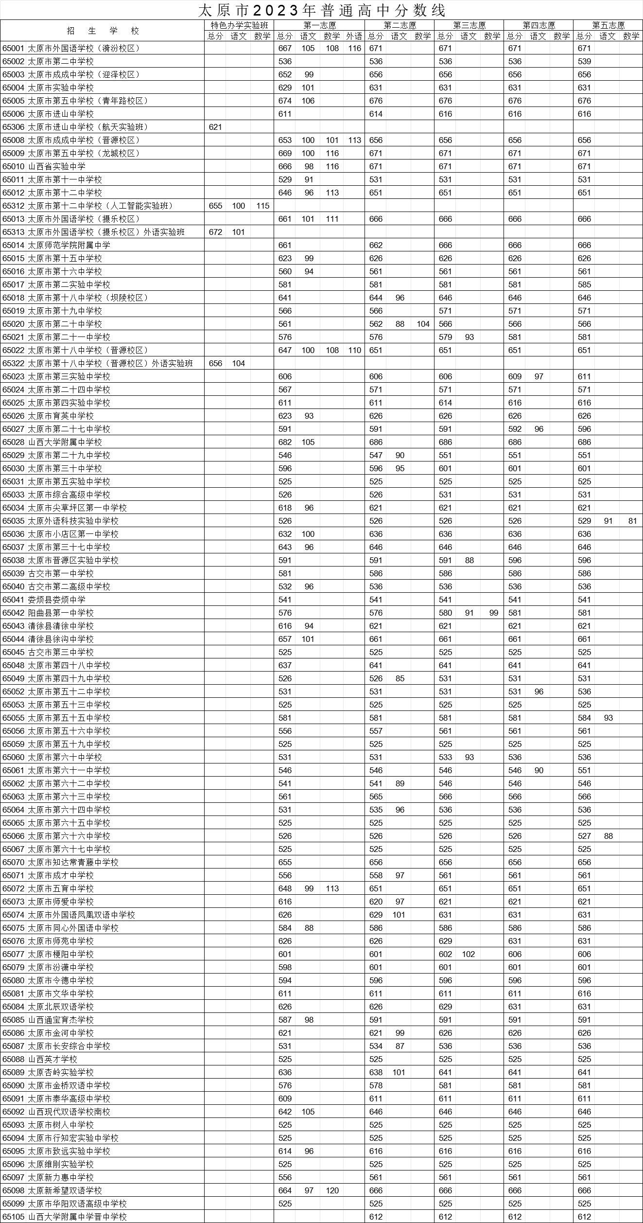 太原市進(jìn)山中學(xué)校航天實(shí)驗(yàn)班、太原市第十二中學(xué)校人工智能實(shí)驗(yàn)班、太原市外國語學(xué)校(攝樂校區(qū))外語實(shí)驗(yàn)班、太原市第十八中學(xué)校(晉源校區(qū))外語實(shí)驗(yàn)班,分?jǐn)?shù)線控制在中考總分85%(2023年為621分)的基礎(chǔ)上,按計(jì)劃、按分?jǐn)?shù)、按志愿擇優(yōu)錄取;進(jìn)山中學(xué)初中航天實(shí)驗(yàn)班在籍考生填報(bào)本校航天實(shí)驗(yàn)班志愿,在全市普通高中最低錄取控制線上按招生計(jì)劃優(yōu)先擇優(yōu)錄取。