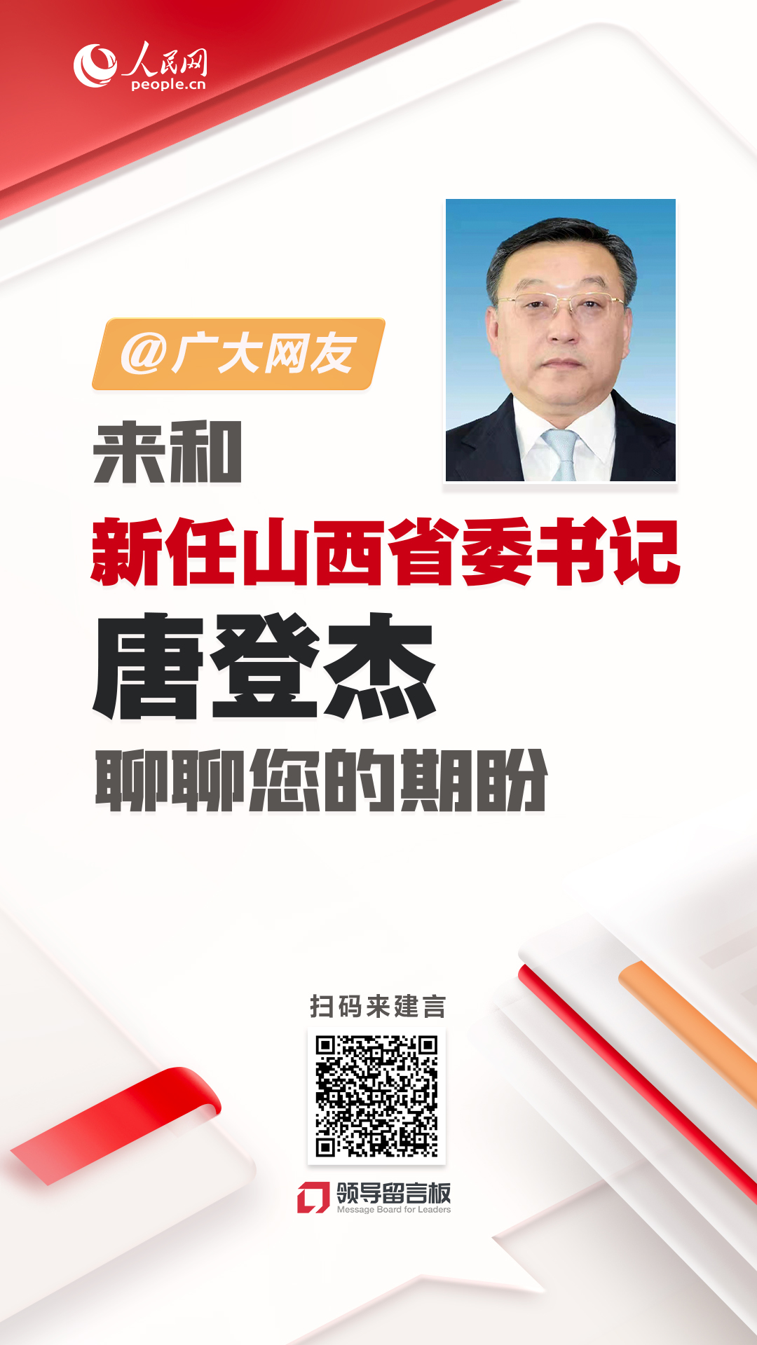 目前,不少群眾已通過人民網(wǎng)“領(lǐng)導(dǎo)留言板”給唐登杰書記留言,反映自己的所思所盼,也為扎實推進山西高質(zhì)量發(fā)展、進一步加快美麗山西建設(shè)建言獻策。