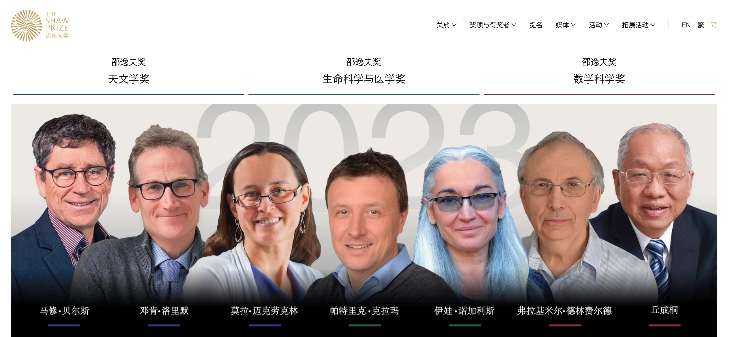 2023年度邵逸夫數(shù)學科學獎平均頒予美國芝加哥大學教授弗拉基米爾·德林費爾德和清華大學丘成桐數(shù)學科學中心主任丘成桐,以表彰他們對數(shù)學物理、算術幾何、微分幾何和凱勒幾何的貢獻。德林費爾德參與推動了幾何朗蘭茲綱領,丘成桐致力于解決廣義相對論和弦理論所引起的數(shù)學問題。