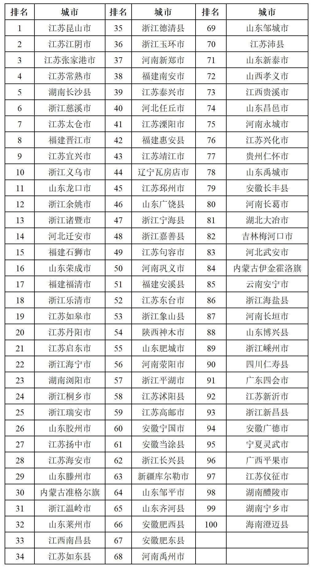 32 內(nèi)蒙古鄂爾多斯市東勝區(qū) 66 浙江嘉興市秀洲區(qū) 100 甘肅酒泉市肅州區(qū)