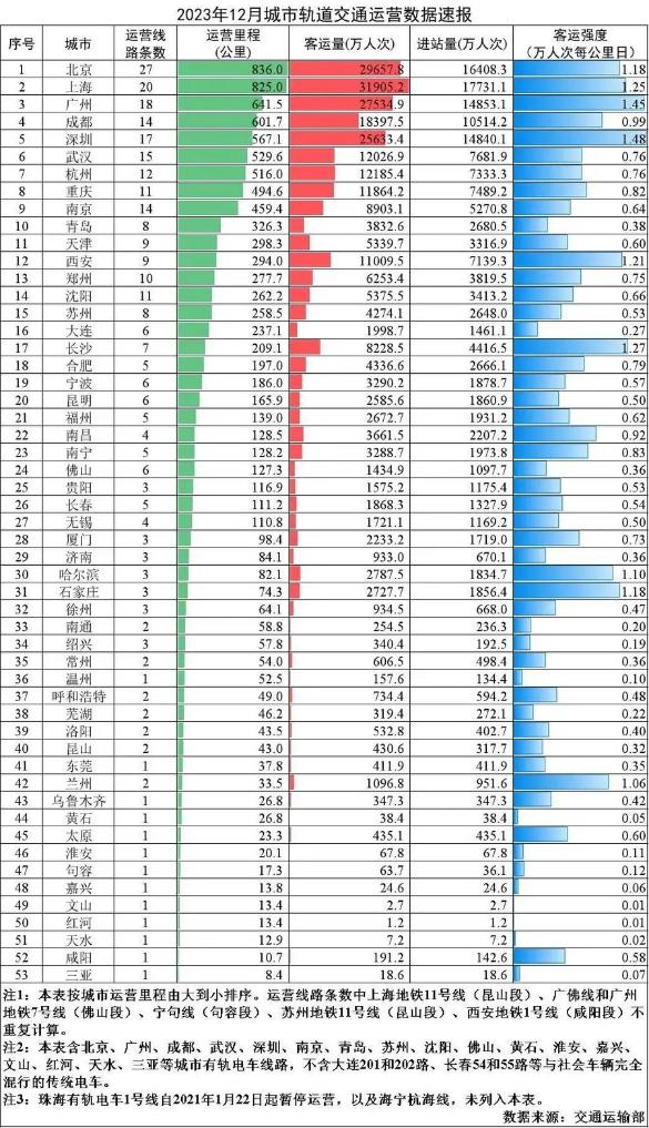 據(jù)交通運(yùn)輸部有關(guān)負(fù)責(zé)人介紹,2023年12月,我國(guó)城市軌道交通新增運(yùn)營(yíng)里程250.1公里,新增運(yùn)營(yíng)線路6條,為武漢地鐵19號(hào)線、重慶地鐵18號(hào)線、天津地鐵11號(hào)線、鄭州地鐵12號(hào)線、貴陽(yáng)地鐵3號(hào)線、南通地鐵2號(hào)線;新增運(yùn)營(yíng)區(qū)段11個(gè),為北京地鐵11號(hào)線西段剩余段、北京地鐵16號(hào)線剩余段、北京地鐵17號(hào)線北段、廣州地鐵5號(hào)線東延段、廣州地鐵7號(hào)線二期、深圳地鐵8號(hào)線二期、武漢地鐵5號(hào)線調(diào)整工程、南京地鐵7號(hào)線南段、合肥地鐵2號(hào)線延長(zhǎng)線、合肥地鐵3號(hào)線延長(zhǎng)線、哈爾濱地鐵3號(hào)線二期西北半環(huán)(中華巴洛克街區(qū)站至北馬路站)。