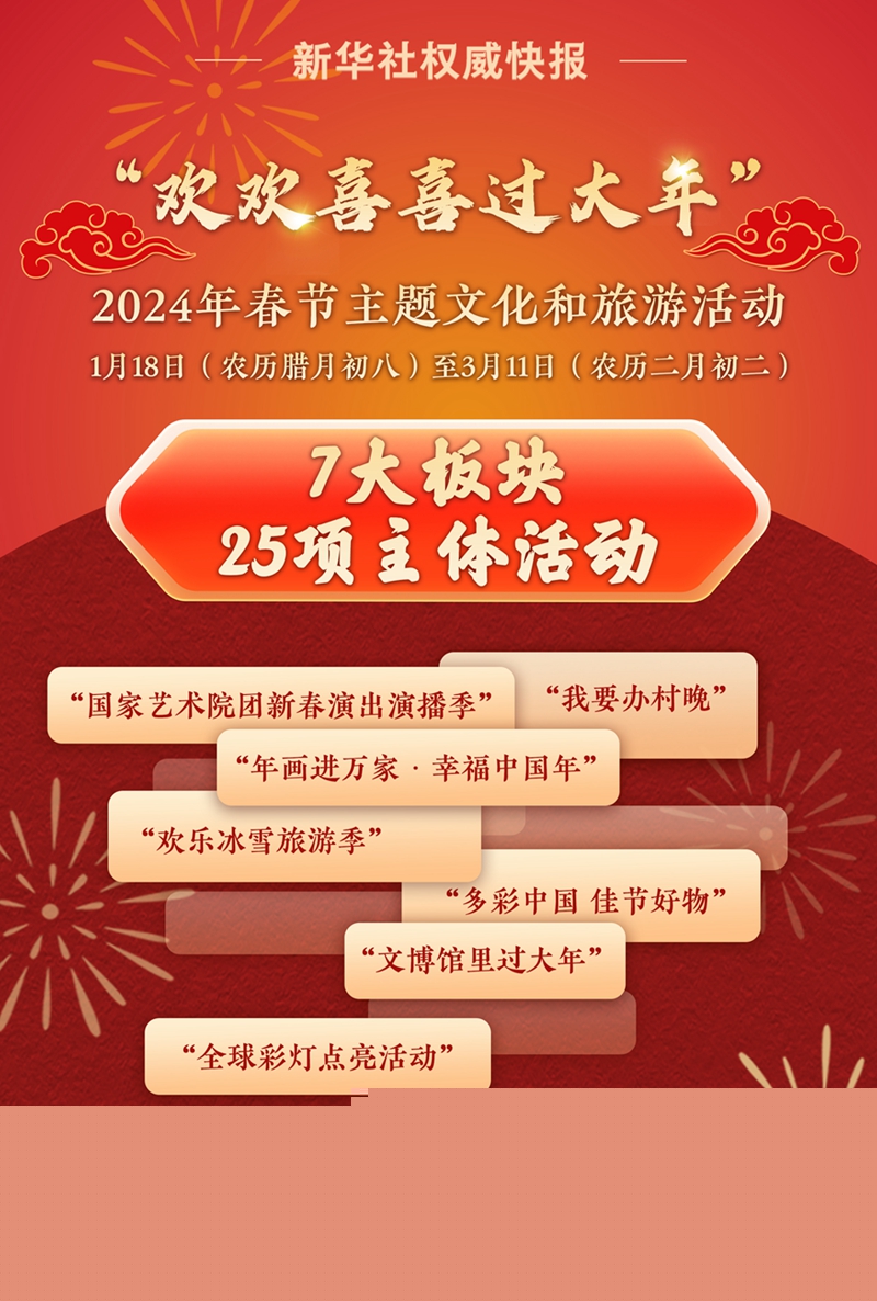 1月18日,文化和旅游部舉行媒體推介會,發(fā)布“歡歡喜喜過大年”2024年春節(jié)主題文化和旅游活動?;顒佑?月18日(農歷臘月初八)至3月11日(農歷二月初二)開展,包含7大板塊共計25項主體活動。