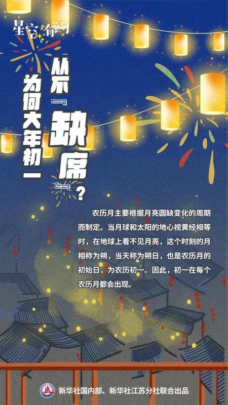 “出現(xiàn)這樣的情況,與我國農歷歷算規(guī)則有關。我國農歷歷法中,農歷月主要是根據(jù)月亮圓缺變化的周期而制定?!敝袊茖W院紫金山天文臺科普主管王科超說,月球繞地球轉動一周的過程中,從地球上看,月亮呈現(xiàn)出不同相貌。當月球和太陽的地心視黃經(jīng)相等時,在地球上看不見月亮,這個時刻的月相稱為朔,當天稱為朔日,是每個農歷月的初始日,稱為農歷初一。因此,初一在每個農歷月都會出現(xiàn)。