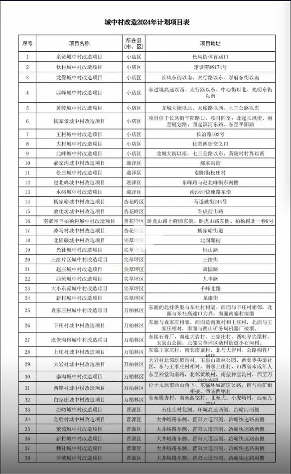 4月9日,一張關(guān)于《城中村改造2024年計劃項目表》不脛而走。其中包含了親賢村、狄村、龍保村、西峰村等38個城改項目,囊括了小店區(qū)、迎澤區(qū)、杏花嶺區(qū)、尖草坪區(qū)、萬柏林區(qū)和晉源區(qū)六大主城區(qū)。