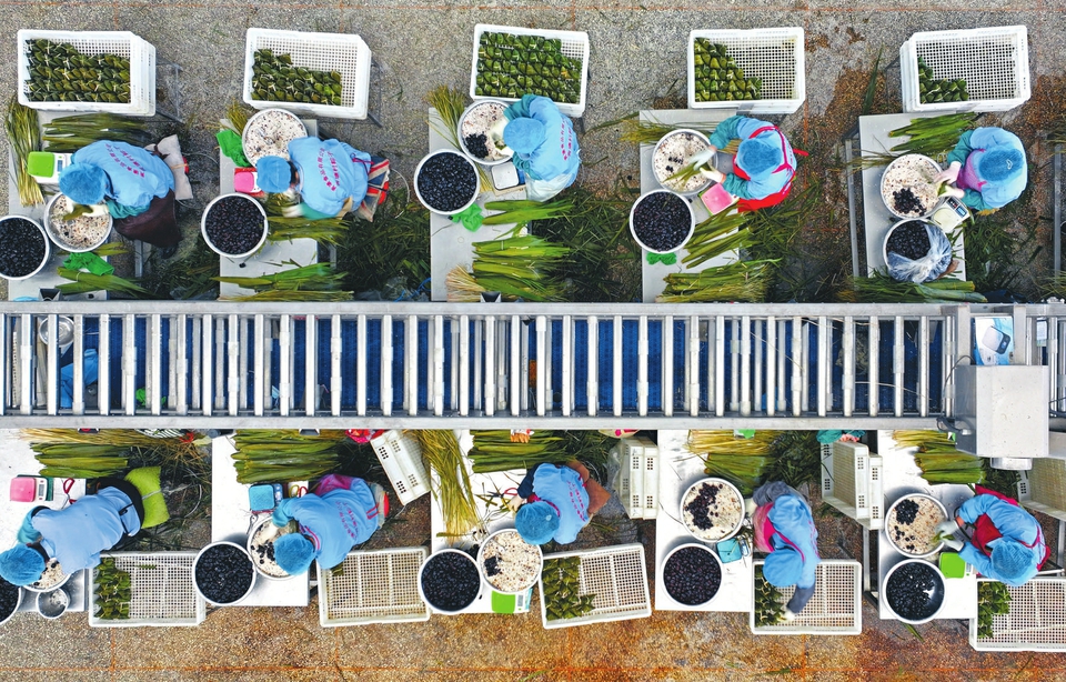 5月31日,在呂梁市臨縣安業(yè)鄉(xiāng)青塘村粽子產(chǎn)業(yè)園生產(chǎn)車間內(nèi),工人們正在有序地包粽子。近年來,青塘村打造了以山西青塘食品有限公司為示范的大中型企業(yè),青塘粽子成為當(dāng)?shù)氐囊粡埫朗趁?/span>