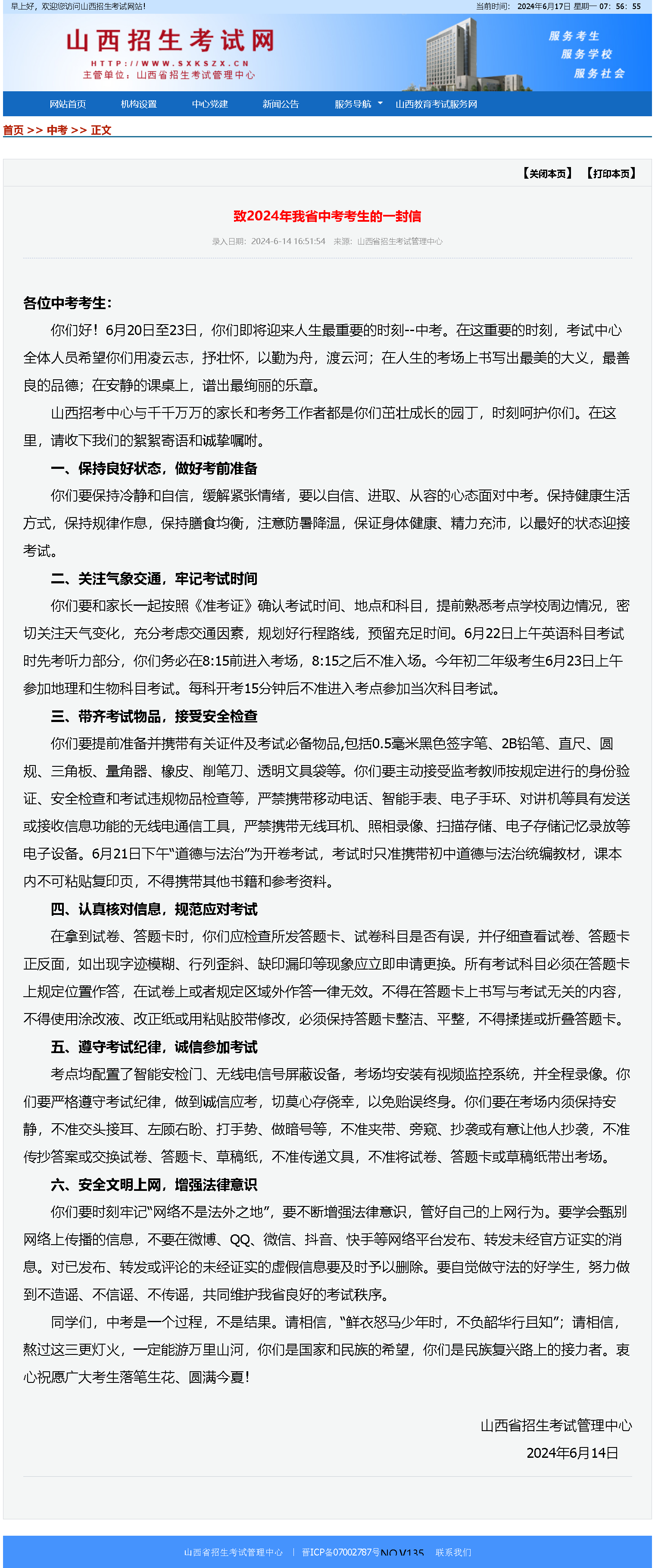 致2024年我省中考考生的一封信 [2024年6月14日]