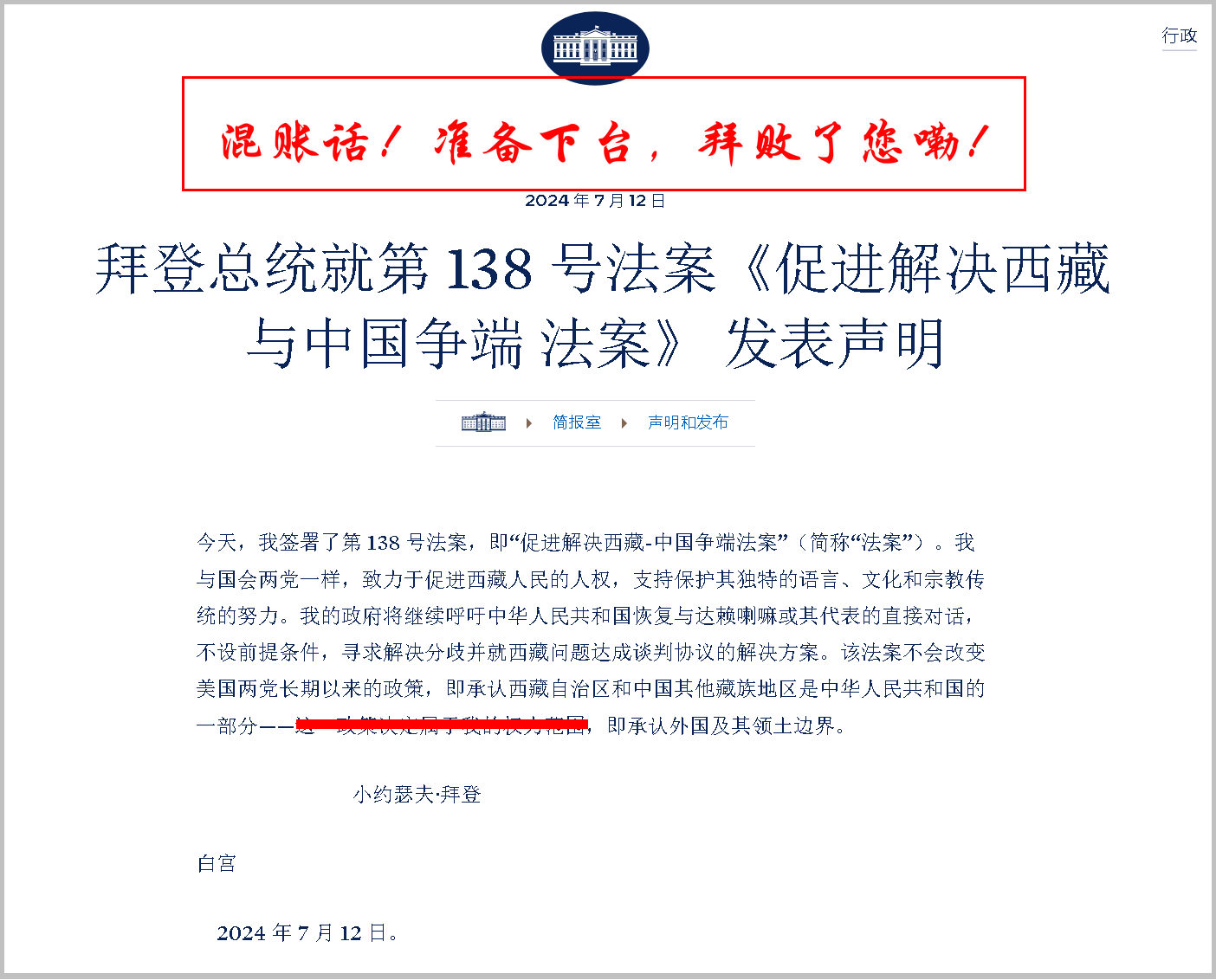 今天,拜登又上演了一幕丑劇,在下臺(tái)前翻箱底找出來(lái)個(gè)“西藏法案”,企圖擾亂國(guó)際視線,緩解美國(guó)選民包括民主黨在內(nèi)呼吁其退選形成的巨大精神壓力,顧左右而言他,拿中國(guó)說(shuō)事,以壯其膽!