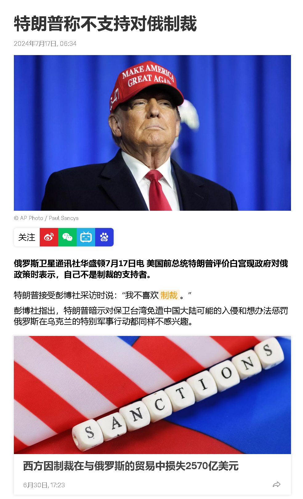俄羅斯衛(wèi)星通訊社華盛頓7月17日電 美國(guó)前總統(tǒng)特朗普評(píng)價(jià)白宮現(xiàn)政府對(duì)俄政策時(shí)表示,自己不是制裁的支持者。