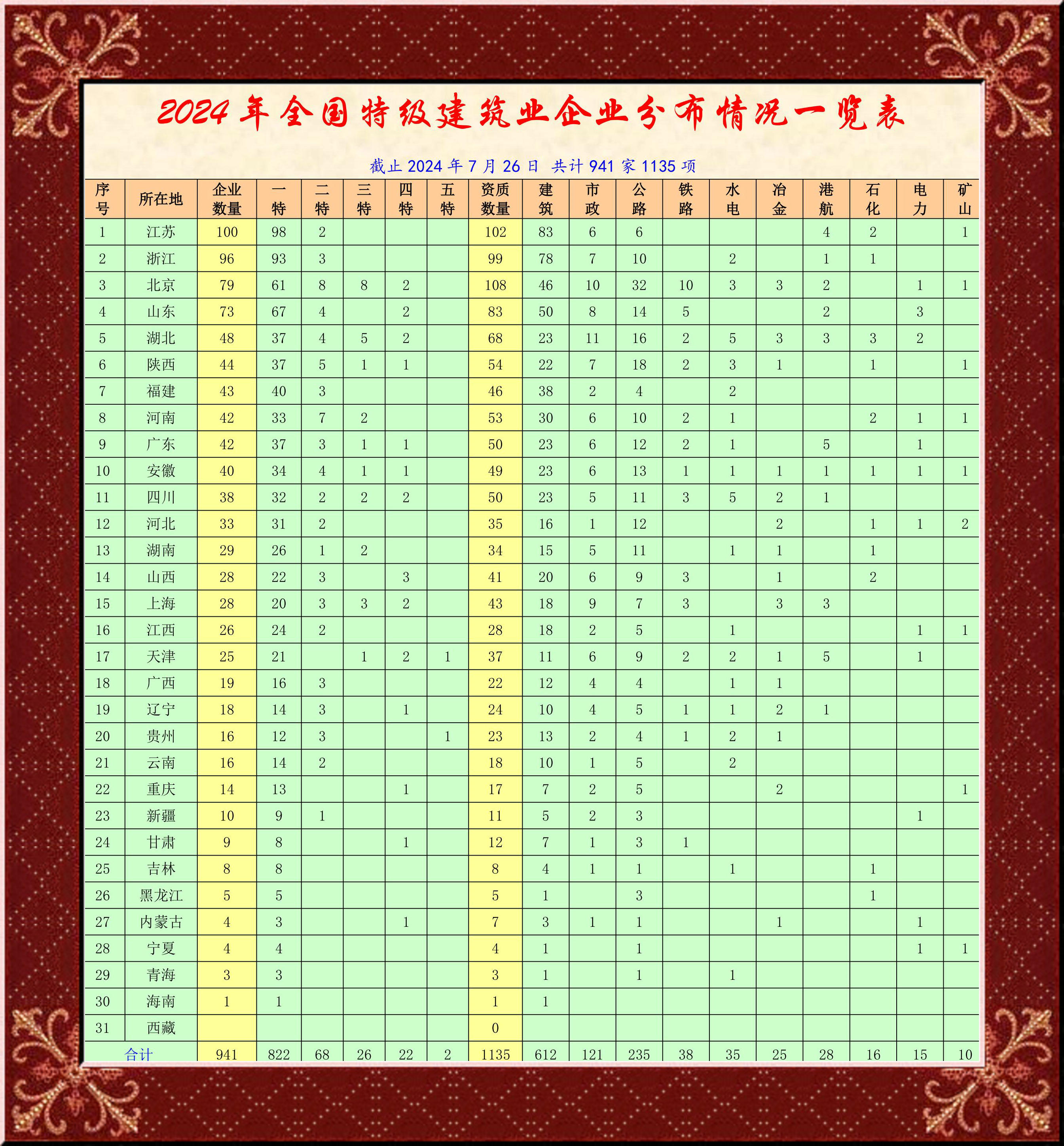 今天,住建部公告了今年第七批核準(zhǔn)建筑業(yè)企業(yè)資質(zhì)名單,56家企業(yè)資質(zhì)升級(jí)或增項(xiàng)。全國(guó)特級(jí)資質(zhì)企業(yè)941家,資質(zhì)1135項(xiàng)。江蘇特級(jí)企業(yè)排名第一,北京資質(zhì)排名第一,浙江特級(jí)企業(yè)排名第二,山東第四。