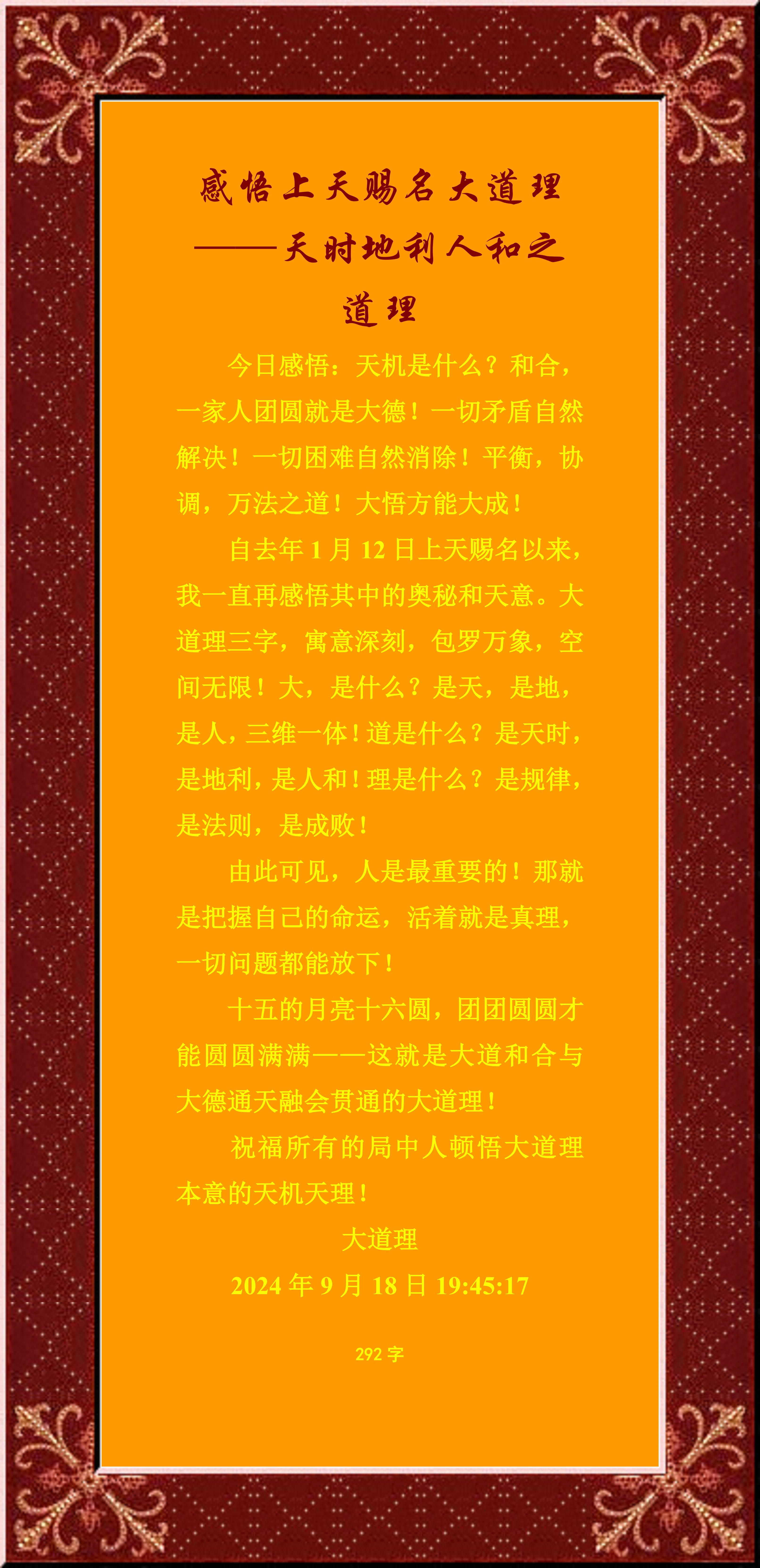 自去年1月12日上天賜名以來(lái),我一直再感悟其中的奧秘和天意。大道理三字,寓意深刻,包羅萬(wàn)象,空間無(wú)限!大,是什么?是天,是地,是人,三維一體!道是什么?是天時(shí),是地利,是人和!理是什么?是規(guī)律,是法則,是成??!