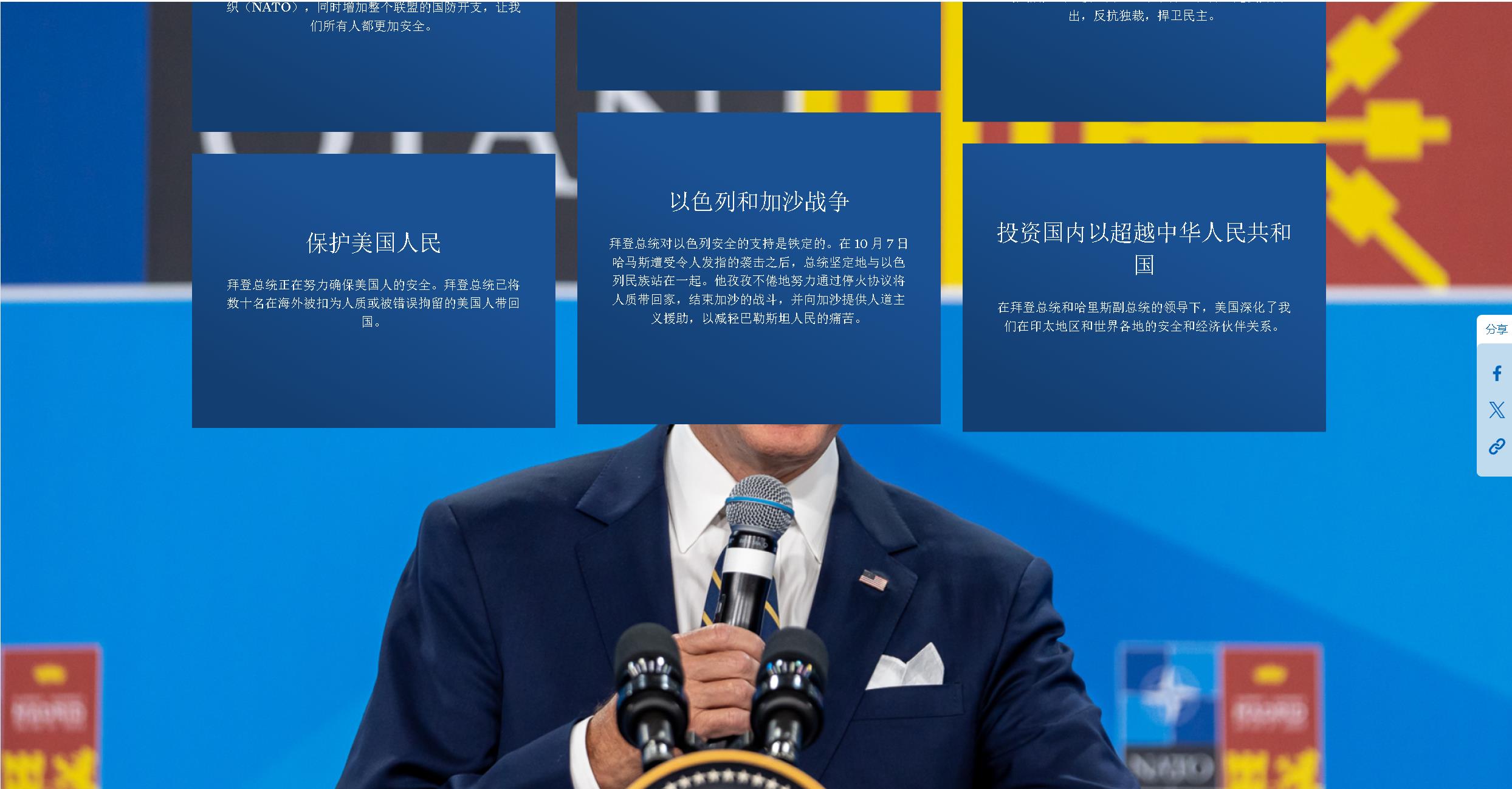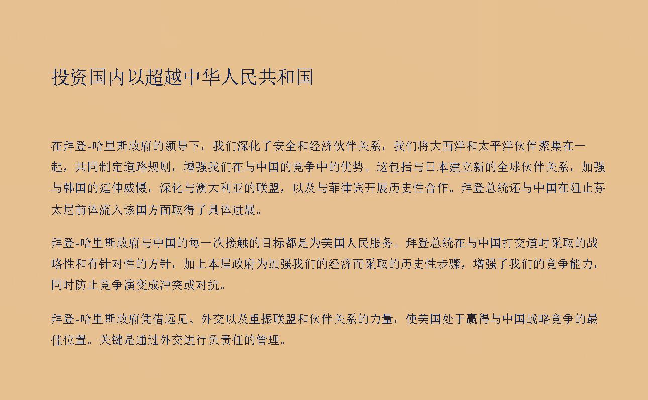 在拜登-哈里斯政府的領導下,我們深化了安全和經濟伙伴關系,我們將大西洋和太平洋伙伴聚集在一起,共同制定道路規(guī)則,增強我們在與中國的競爭中的優(yōu)勢。這包括與日本建立新的全球伙伴關系,加強與韓國的延伸威懾,深化與澳大利亞的聯盟,以及與菲律賓開展歷史性合作。拜登總統還與中國在阻止芬太尼前體流入該國方面取得了具體進展。