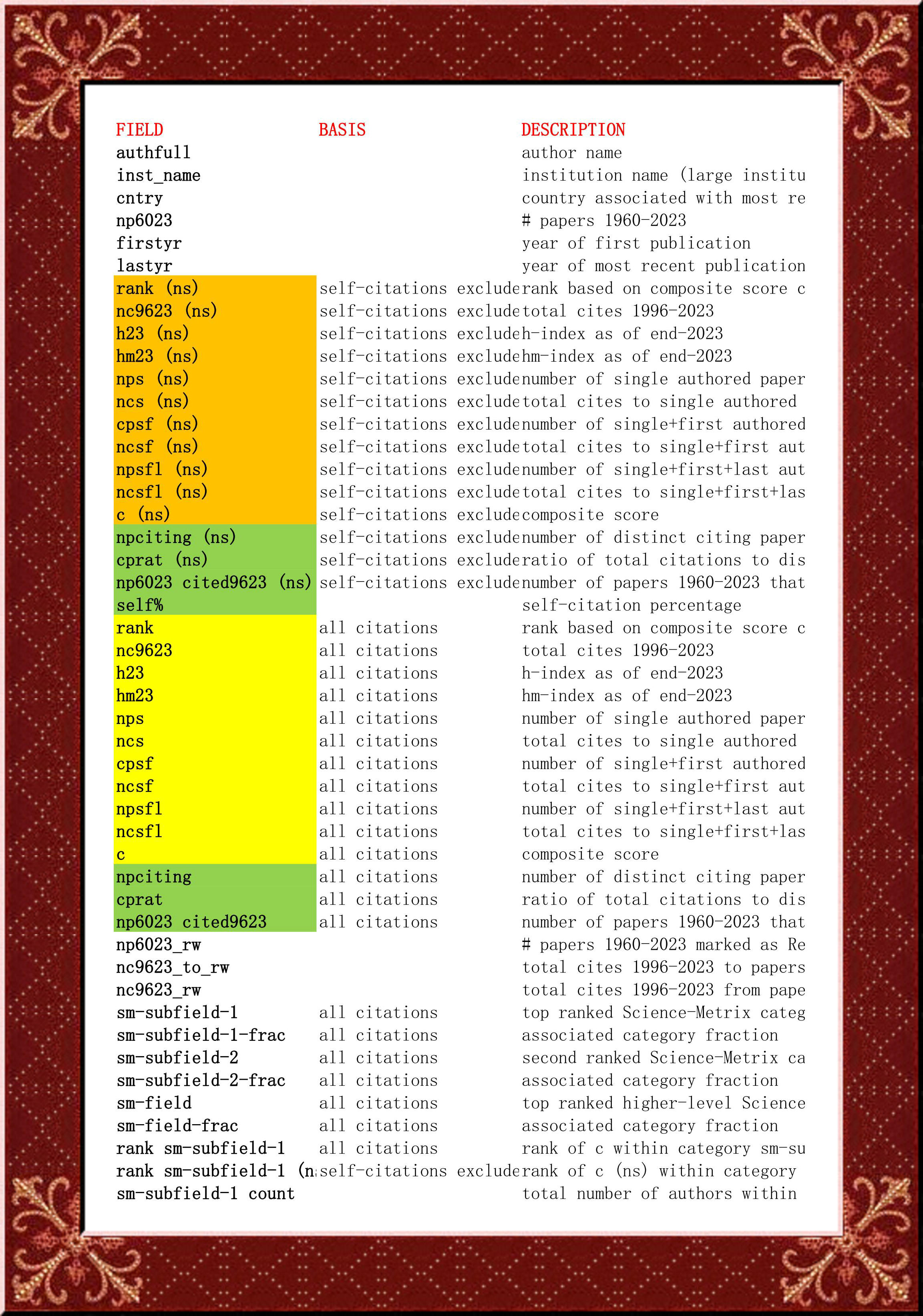引用指標(biāo)被廣泛使用和濫用。我們創(chuàng)建了一個(gè)公開(kāi)的高被引科學(xué)家數(shù)據(jù)庫(kù),提供有關(guān)引用、h 指數(shù)、共同作者調(diào)整后的 hm 指數(shù)、不同作者職位的論文引用和綜合指標(biāo)(c 分?jǐn)?shù))的標(biāo)準(zhǔn)化信息。單獨(dú)的數(shù)據(jù)顯示了整個(gè)職業(yè)生涯的數(shù)據(jù),并單獨(dú)顯示了最近一年的影響。給出了有無(wú)自引的指標(biāo)以及引用與施引論文的比率,并在最近的迭代中添加了撤回論文的數(shù)據(jù)(基于撤回觀察數(shù)據(jù)庫(kù))以及撤回論文的引用。根據(jù)標(biāo)準(zhǔn) Science-Metrix 分類(lèi),科學(xué)家被分為 22 個(gè)科學(xué)領(lǐng)域和 174 個(gè)子領(lǐng)域。還為所有至少發(fā)表 5 篇論文的科學(xué)家提供特定領(lǐng)域和子領(lǐng)域的百分位數(shù)。整個(gè)職業(yè)生涯的數(shù)據(jù)更新至 2023 年底,最近一年的數(shù)據(jù)與 2023 日歷年收到的引用有關(guān)。選擇基于 c 分?jǐn)?shù)(有或沒(méi)有自引)或百分位排名前 100,000 名科學(xué)家子領(lǐng)域排名2%以上。此版本 (7) 基于 Scopus 2024 年 8 月 1 日的快照,更新至 2023 年引文結(jié)束。本工作使用 Scopus 數(shù)據(jù)。使用截至 2024 年 8 月 1 日的所有 Scopus 作者資料進(jìn)行計(jì)算。如果某個(gè)作者未出現(xiàn)在列表中,那只是因?yàn)榫C合指標(biāo)值不夠高,無(wú)法出現(xiàn)在列表中。這并不意味著作者做得不好。另請(qǐng)注意,數(shù)據(jù)庫(kù)已以存檔形式發(fā)布,不會(huì)更改。發(fā)布的版本反映了計(jì)算時(shí)的 Scopus 作者簡(jiǎn)介。因此,我們建議作者確保他們的 Scopus 資料準(zhǔn)確無(wú)誤。不應(yīng)向我們發(fā)送 SCOPUS 數(shù)據(jù)更正請(qǐng)求(包括隸屬關(guān)系更正)。它們應(yīng)直接發(fā)送到 Scopus,最好使用 Scopus 到 ORCID 反饋向?qū)?(https://orcid.scopusfeedback.com/),以便在未來(lái)引文指標(biāo)數(shù)據(jù)庫(kù)的任何年度更新中可以使用正確的數(shù)據(jù)。 c-score 側(cè)重于影響力(引用)而不是生產(chǎn)力(出版物數(shù)量),它還包含有關(guān)共同作者和作者職位(單一、第一、最后作者)的信息。如果您還有其他問(wèn)題,請(qǐng)參閱有關(guān)常見(jiàn)問(wèn)題的附件。最后,我們提醒用戶(hù),所有引文指標(biāo)都有局限性,其使用應(yīng)謹(jǐn)慎且明智。如需更多閱讀,我們參考萊頓宣言:https://www.nature.com/articles/520429a