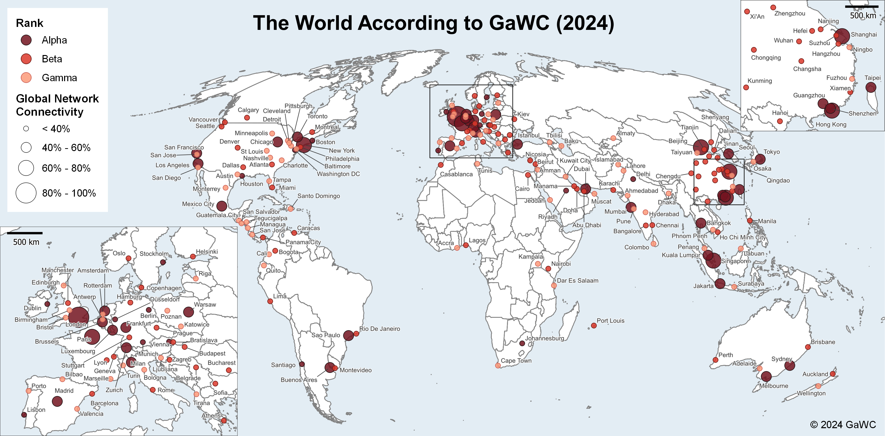 GaWC 認(rèn)為的世界是一個(gè)以城市為中心的流動(dòng)世界,與更熟悉的以國(guó)家為中心的邊界世界形成鮮明對(duì)比。