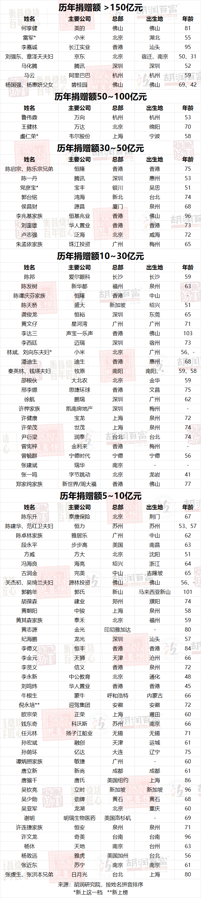 序號(hào) 姓名 捐贈(zèng)額(¥億元) 年度 排名