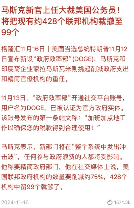 特朗普宣布將成立“政府效率部(DOGE)”,交給馬斯克和印度裔企業(yè)家拉瑪斯瓦米掌管,唯一目的就是給美國政府進(jìn)行裁員。