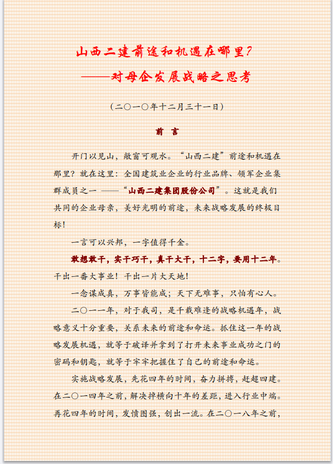 十三年前,《思考》一文。開門見山指出山西二建的終極目標(biāo),就是“山西二建集團(tuán)股份有限公司”。可惜的是,掌門人和繼承人沒有這樣的長(zhǎng)遠(yuǎn)打算和具體部署,根本原因就是沒有理解發(fā)展戰(zhàn)略的重要意義。我甚至把“ http://www.sxejgfyxgs.com/”作為山西二建股份有限公司網(wǎng)站地址。