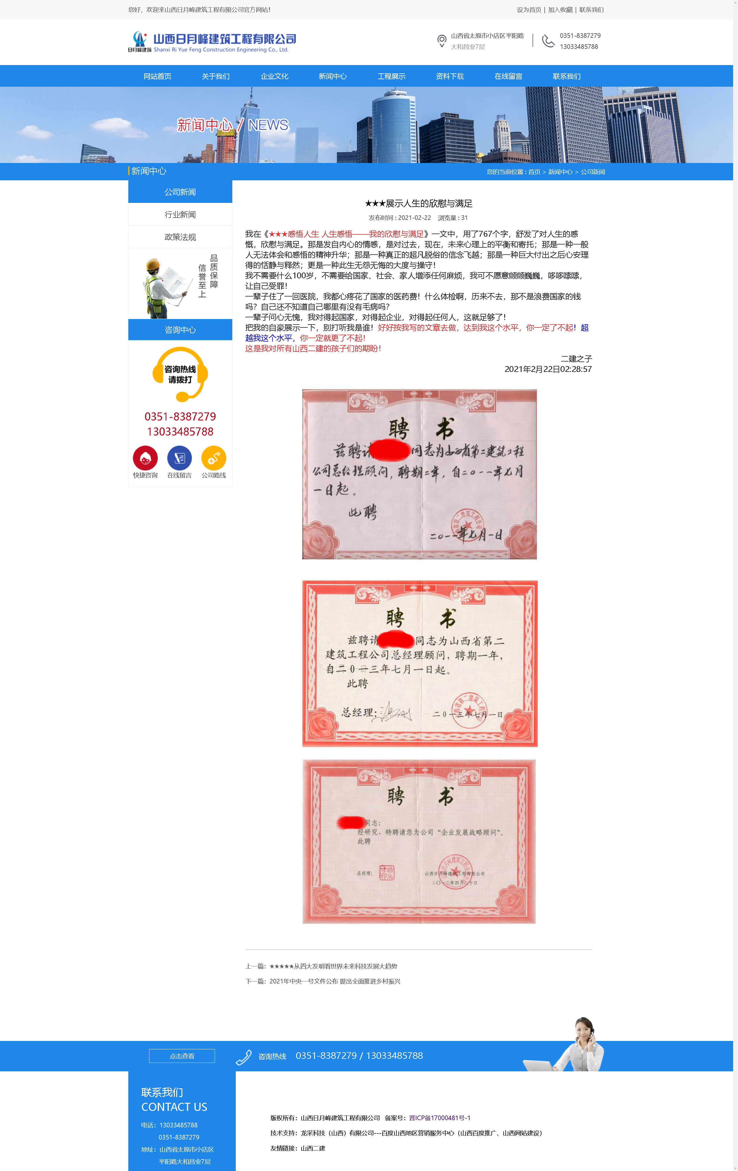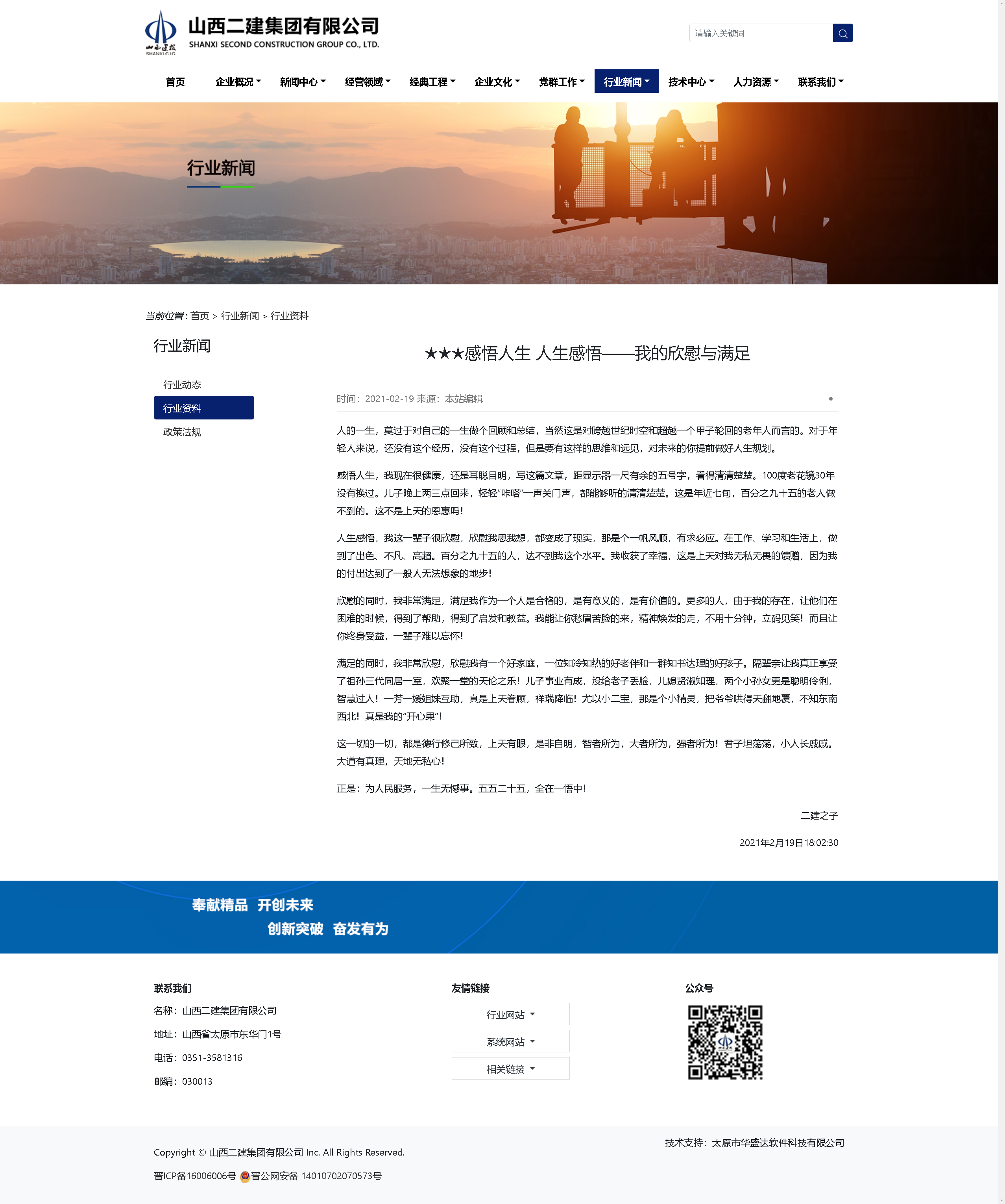 然而,最讓我感到驕傲和自豪的是,上天成就了我的愿望,成就了我的人生,那就是在我的母企面臨危機(jī)的時(shí)候,毫不猶豫義無反顧參與了成就山西二建集團(tuán)有限公司的大翻身,找回了我們企業(yè)昔日的尊嚴(yán)和榮譽(yù)!之后,在輔佐楊總成就未來的過程中,又有了新的目標(biāo)和新的使命,成就上天安排的中華永恒久遠(yuǎn)的華恒遠(yuǎn)!