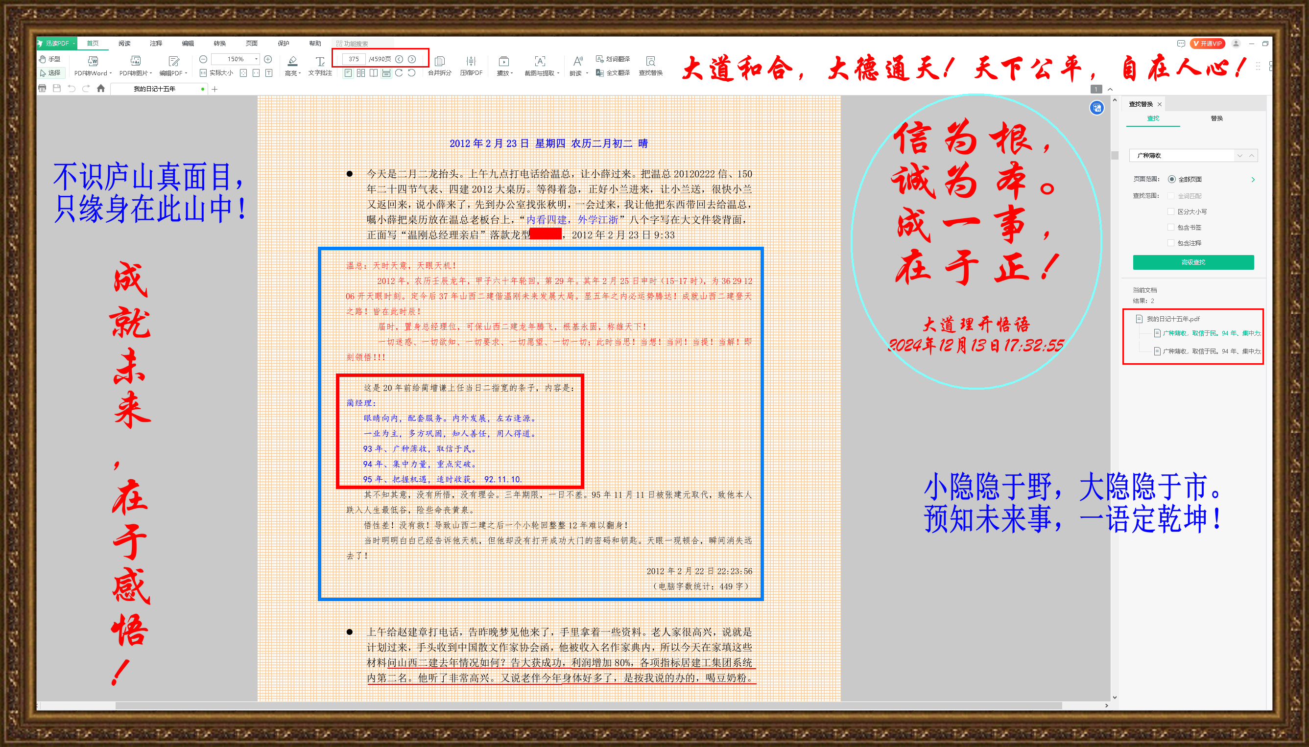 剛才查閱日記,查找《感悟三十年前的一件往事——感應(yīng)達(dá)到靈性的升華》這篇文章,這是寫(xiě)給二建掌門人的一封信中的內(nèi)容。那年正好六十歲,也是龍年,被正式聘為總經(jīng)理顧問(wèn),這在二公司是一件暴炸性的新聞,尤其是2011年1月5日第一次與掌門人會(huì)悟后的第二天,我的名字在單位全體干部大會(huì)上讓所有參會(huì)人感到驚訝!就連內(nèi)弟女兒分公司經(jīng)理都對(duì)她說(shuō),你大姑父太厲害了,溫總在大會(huì)上講,此人真是他從未見(jiàn)過(guò)的高人,我所有的困惑和難題,人家全都給了解疑答惑,一篇文章就能改變我的決定改變山西二建的命運(yùn)!贊揚(yáng)恭敬之意不絕于耳,更讓以前認(rèn)識(shí)他的人頗感神奇!趁著熱議,孩子告訴她的經(jīng)理:我大姑父說(shuō),你是未來(lái)的總經(jīng)理!這句話一語(yǔ)成讖:現(xiàn)在的董事長(zhǎng)就是胡孟師,當(dāng)時(shí)的八分公司經(jīng)理!
