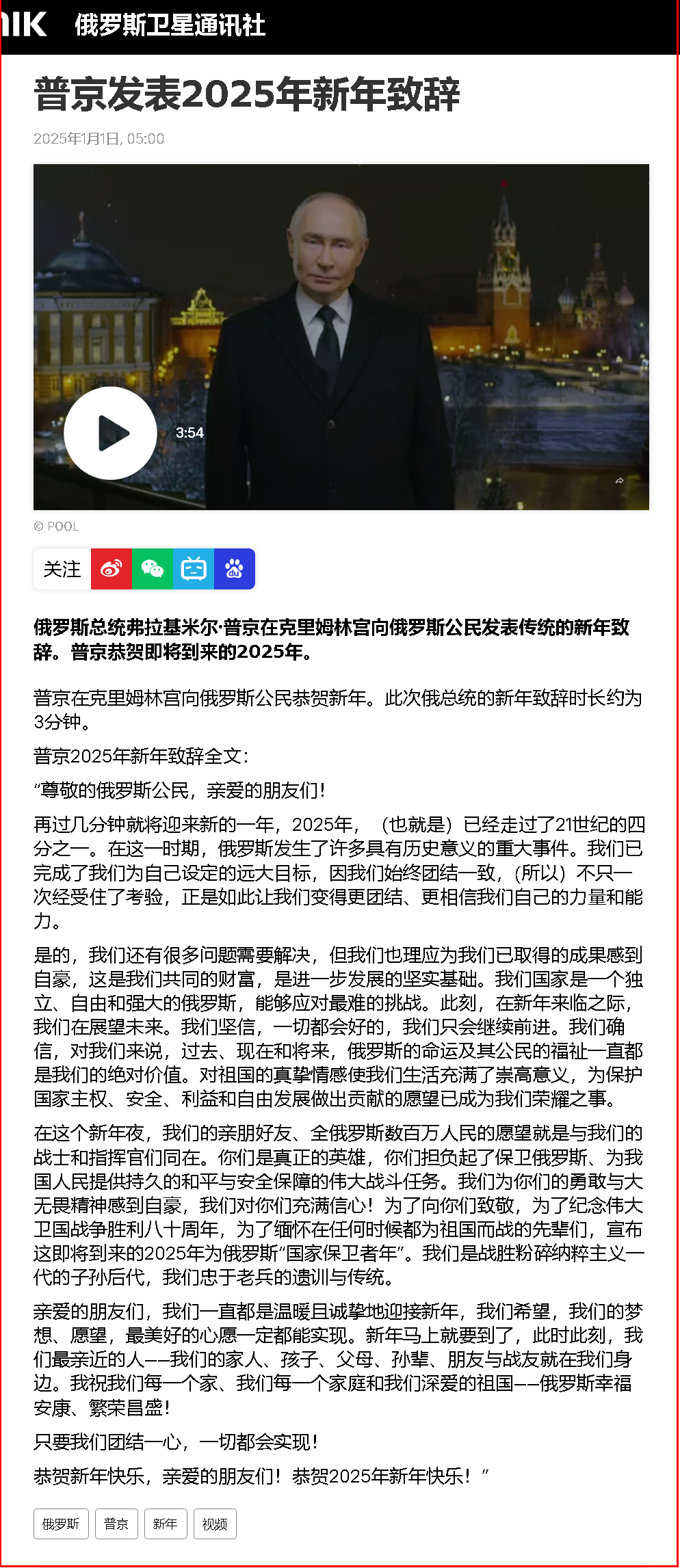 俄羅斯總統(tǒng)普京2025年新年致辭,向全世界發(fā)出一個(gè)強(qiáng)烈信號(hào)——那就是開創(chuàng)人類社會(huì)公平正義的新世界!