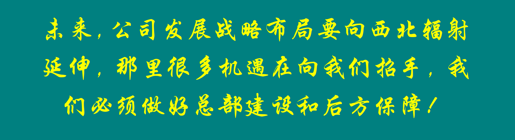 剛才,掌門(mén)人新疆發(fā)回信息,回復(fù):“可,拿下!為下一步鋪路!”未來(lái),公司發(fā)展戰(zhàn)略布局要向西北輻射延伸,那里很多機(jī)遇在向我們招手,我們必須做好總部建設(shè)和后方保障!