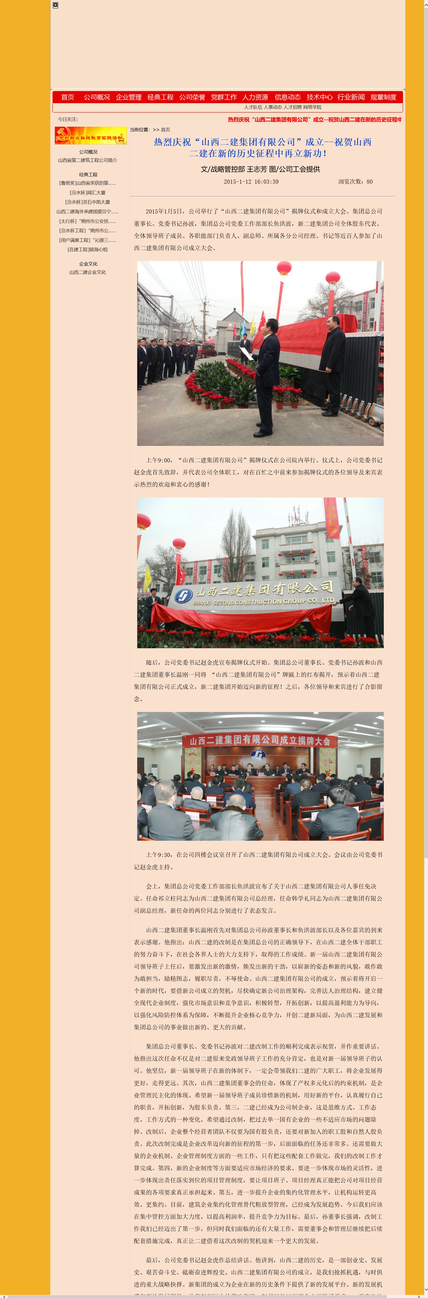 當(dāng)時(shí),他立刻打電話通知對(duì)方原路返回,表示承擔(dān)一切損失。隨后完全按照我的意見(jiàn)實(shí)施,就連字體都是征求我的意見(jiàn)制作的。2015年1月5日,山西二建集團(tuán)有限公司揭牌儀式順利進(jìn)行,使用近三十五年的山西省第二建筑工程公司名稱正式退出歷史舞臺(tái),宣告改制后的山西二建正式成立!