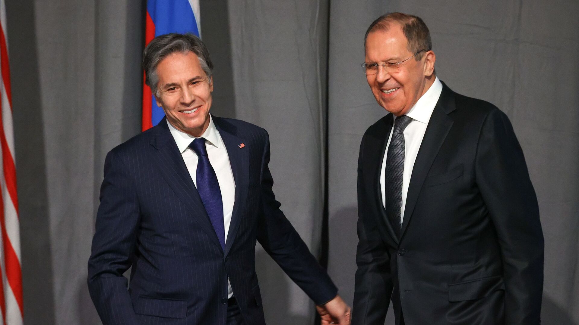 2022年1月,時任美國國務卿布林肯(左一)與俄羅斯外長拉夫羅夫在日內瓦舉行會談