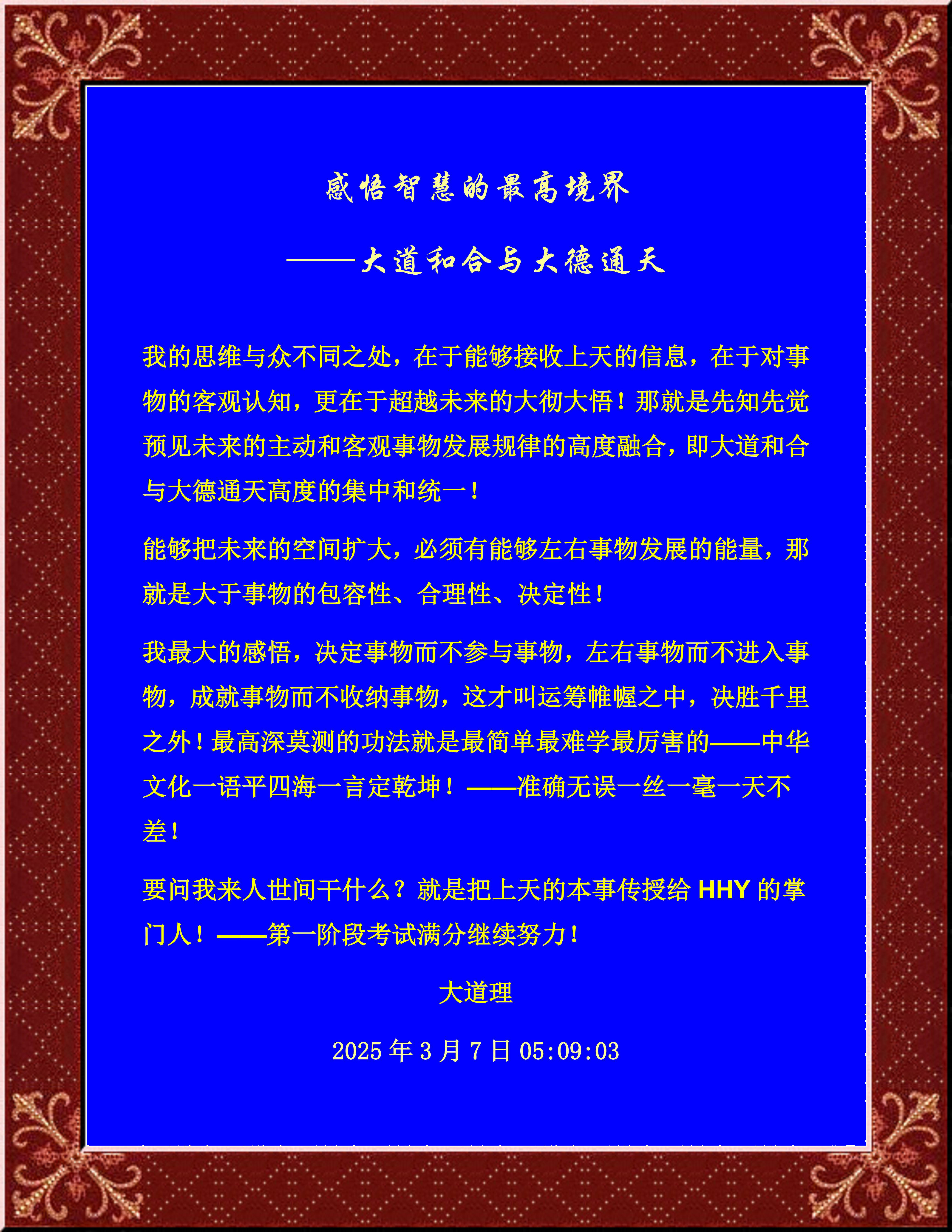 我的思維與眾不同之處,在于能夠接收上天的信息,在于對(duì)事物的客觀認(rèn)知,更在于超越未來(lái)的大徹大悟!那就是先知先覺(jué)預(yù)見(jiàn)未來(lái)的主動(dòng)和客觀事物發(fā)展規(guī)律的高度融合,即大道和合與大德通天高度的集中和統(tǒng)一!