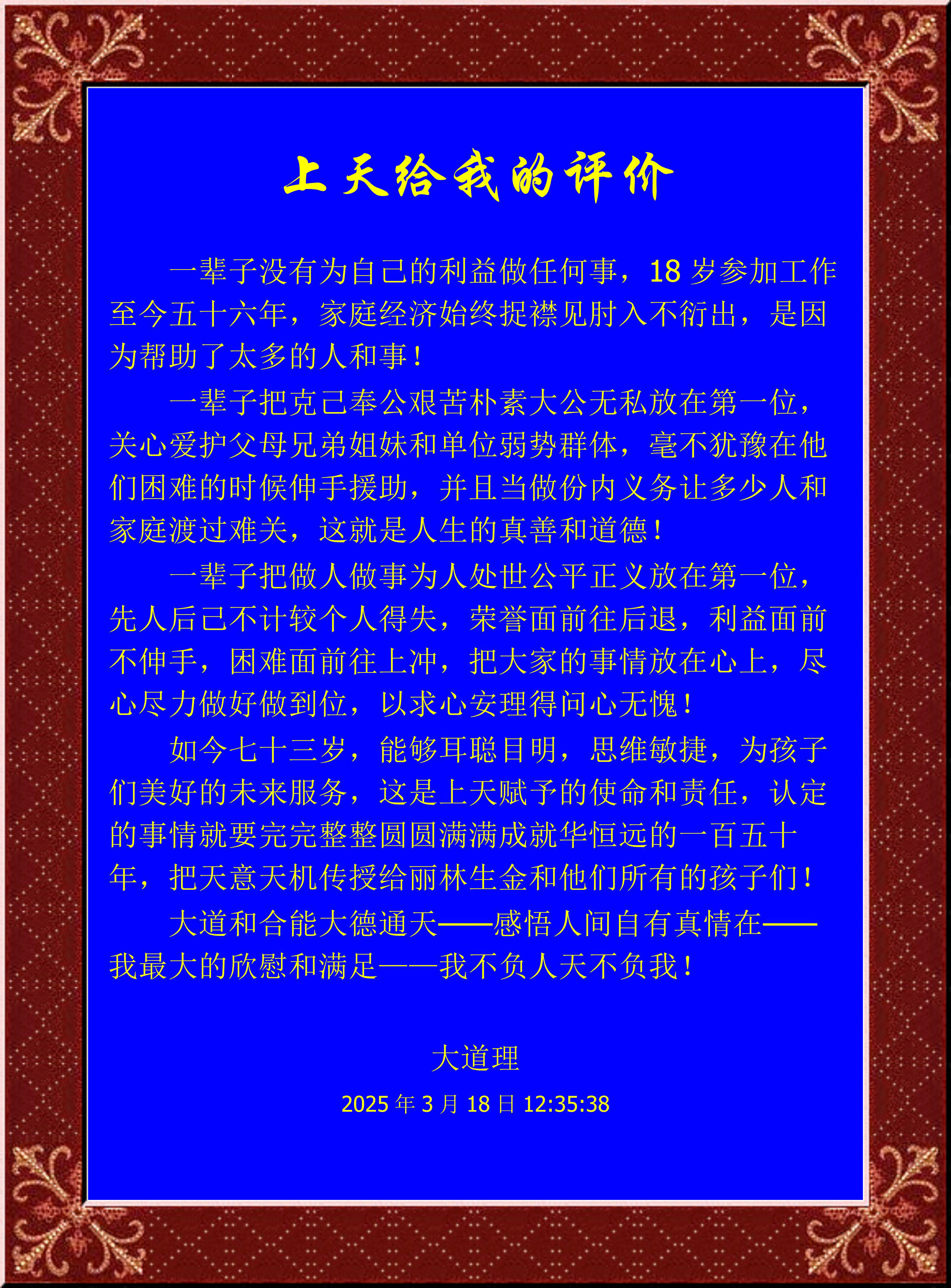 大道和合能大德通天——感悟人間自有真情在——我最大的欣慰和滿足——我不負(fù)人天不負(fù)我!