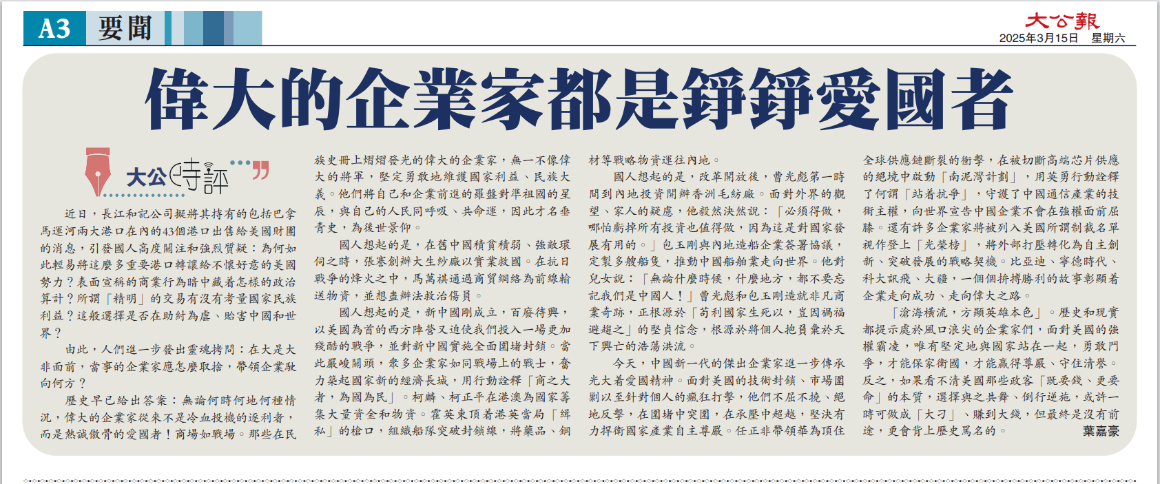 大公時評:偉大的企業(yè)家都是錚錚愛國者2025-03-15