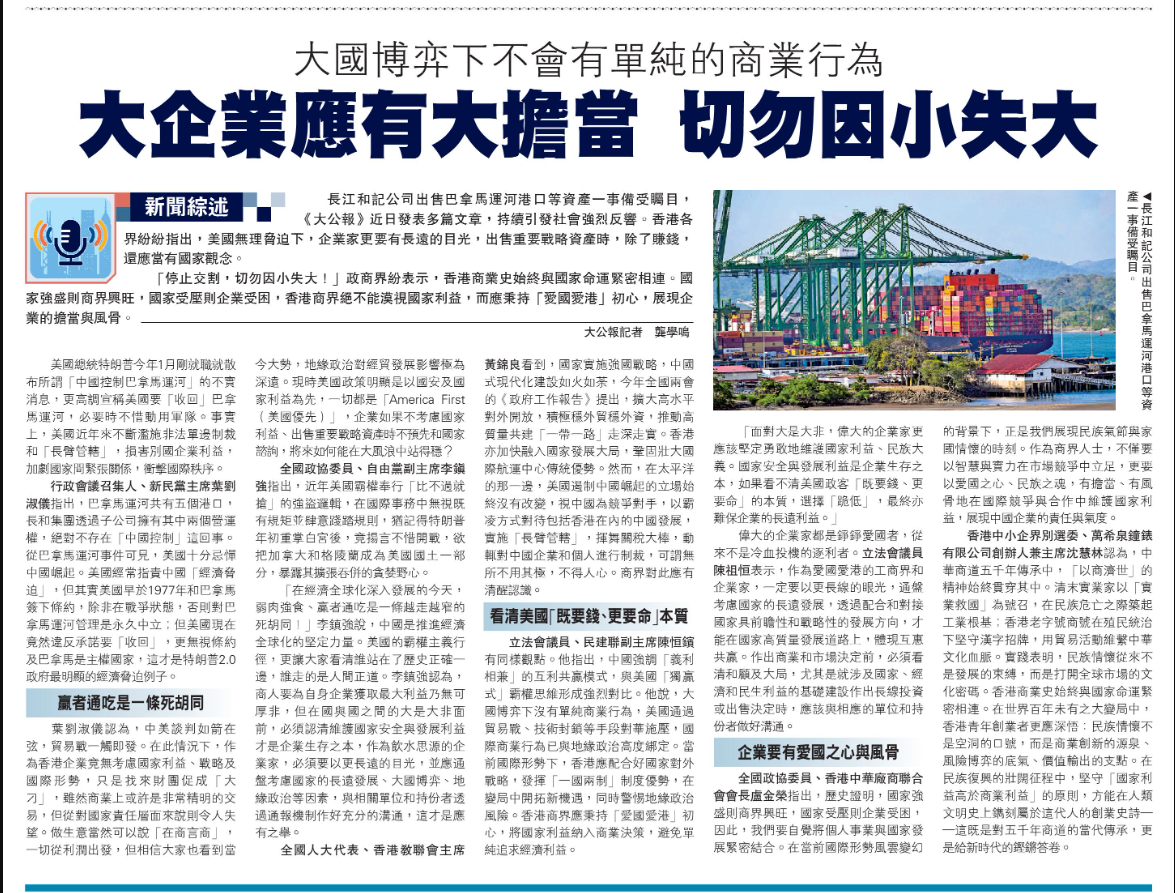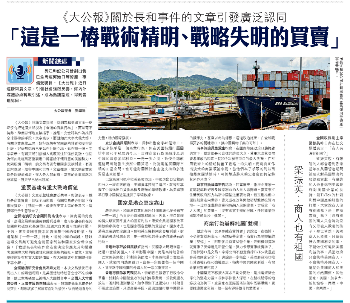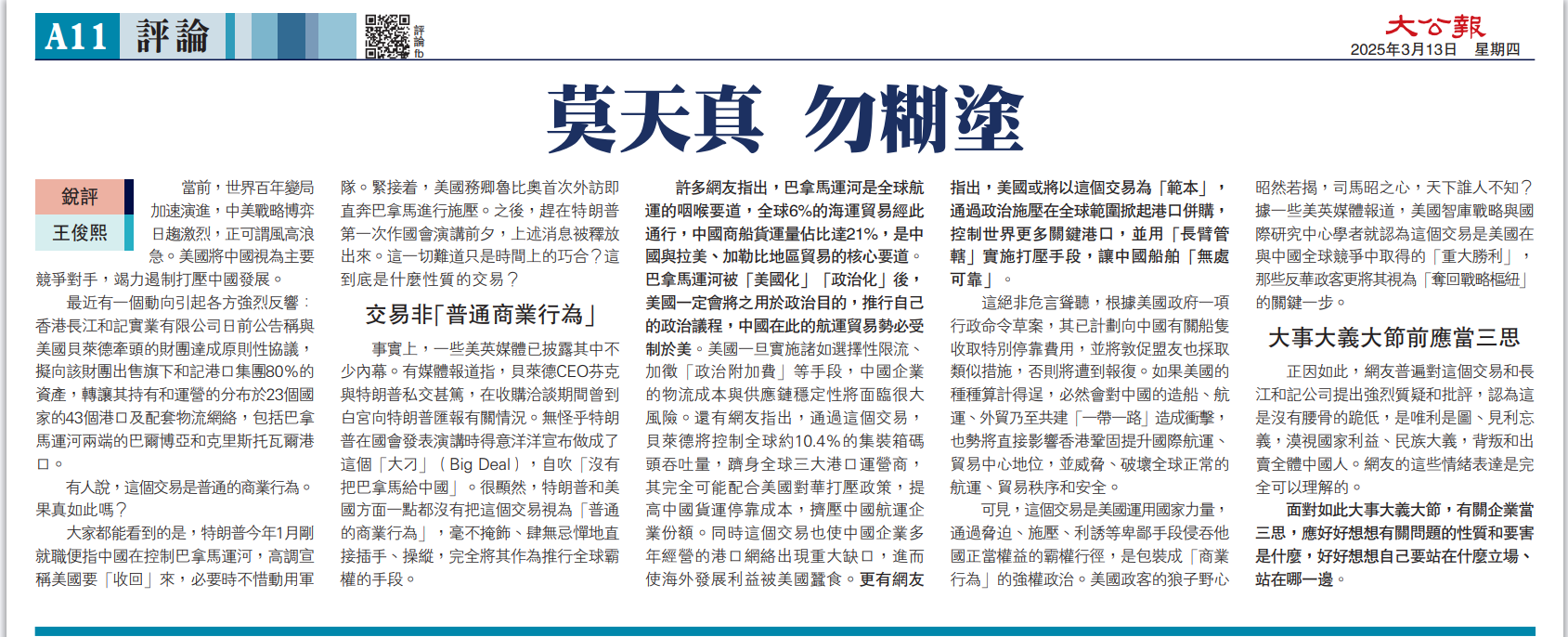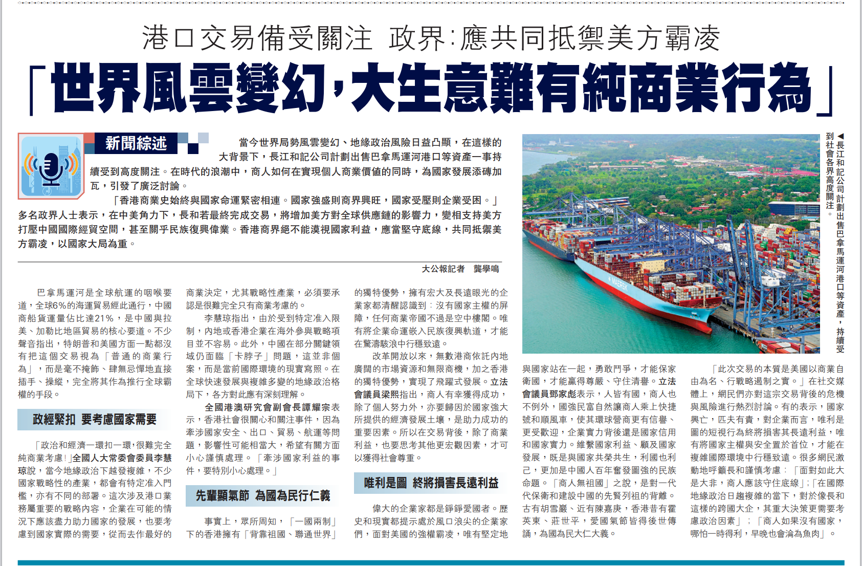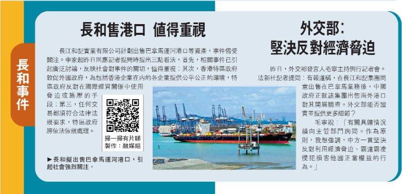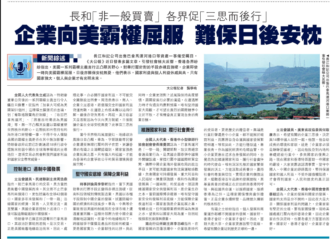 新聞綜述/急售運河港口予美資 專家質(zhì)疑「非一般買賣」 「企業(yè)面對霸權(quán)霸凌,應(yīng)與國家站在一起」2025-03-27