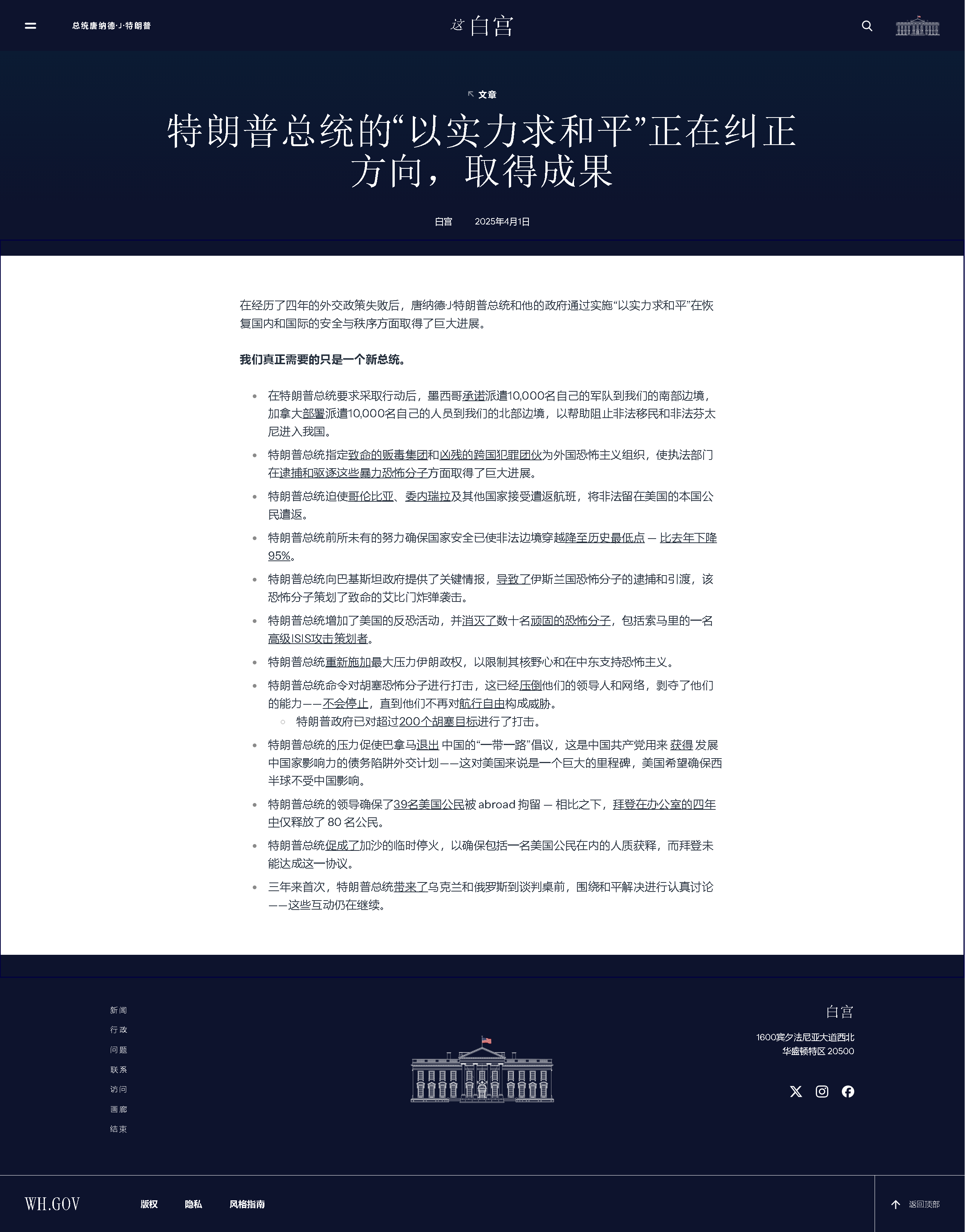 在經(jīng)歷了四年的外交政策失敗后,唐納德·J·特朗普總統(tǒng)和他的政府通過(guò)實(shí)施“以實(shí)力求和平”在恢復(fù)國(guó)內(nèi)和國(guó)際的安全與秩序方面取得了巨大進(jìn)展。