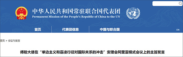 據(jù)中國常駐聯(lián)合國代表團(tuán)網(wǎng)站消息,當(dāng)?shù)貢r(shí)間4月23日,中國常駐聯(lián)合國代表傅聰大使在“單邊主義和霸凌行徑對國際關(guān)系的沖擊”安理會(huì)阿里亞模式會(huì)議上進(jìn)行主旨發(fā)言。