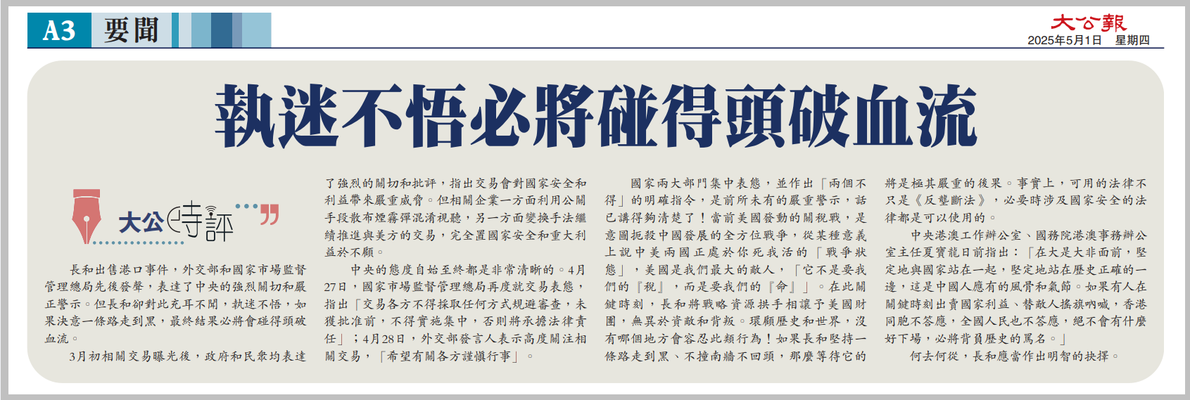 13 大公報(bào):長和買賣不得人心 港各界:審查合情合理合法 2025-04-02