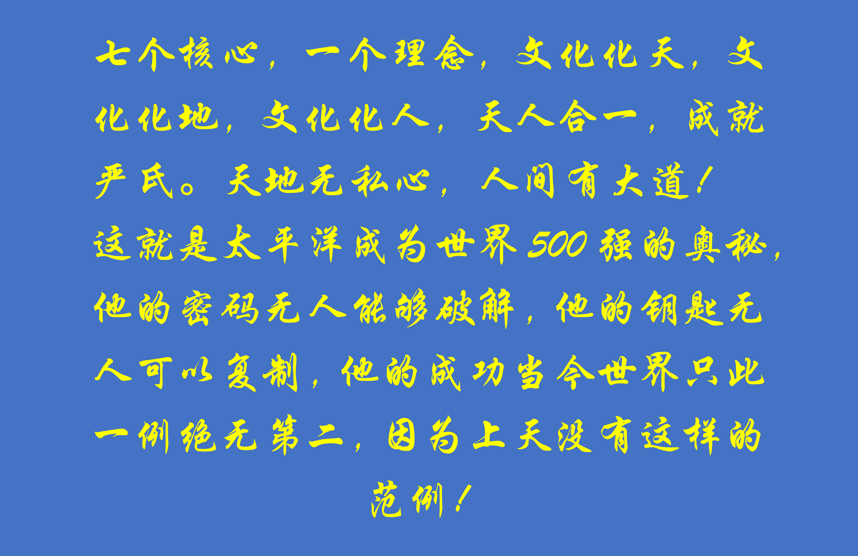 這就是太平洋成為世界500強的奧秘,他的密碼無人能夠破解,他的鑰匙無人可以復(fù)制,他的成功當(dāng)今世界只此一例絕無第二,因為上天沒有這樣的范例!