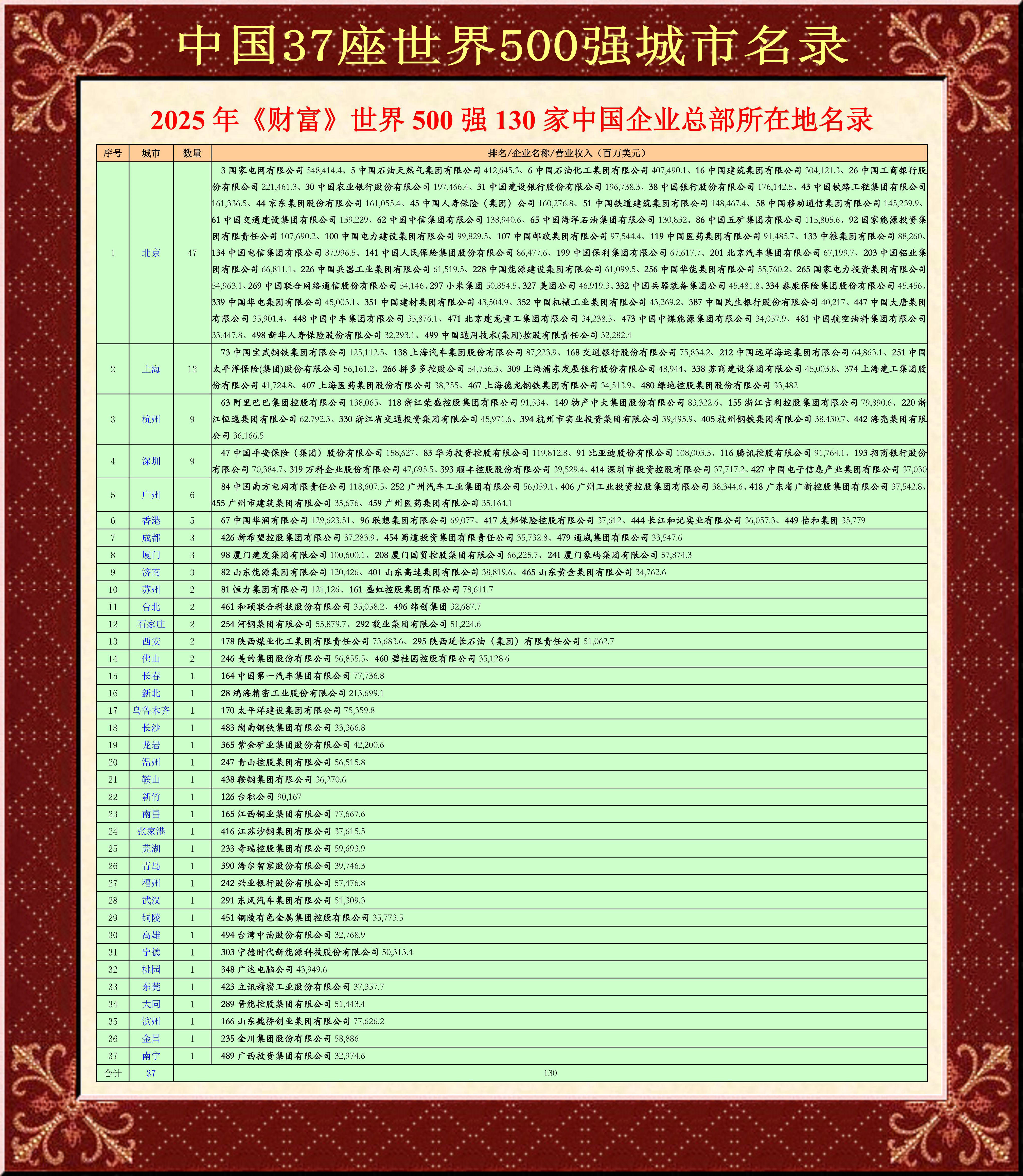 【行業(yè)動(dòng)態(tài)】33個(gè)內(nèi)地城市世界500強(qiáng)全覽:哪里民企巨頭最多