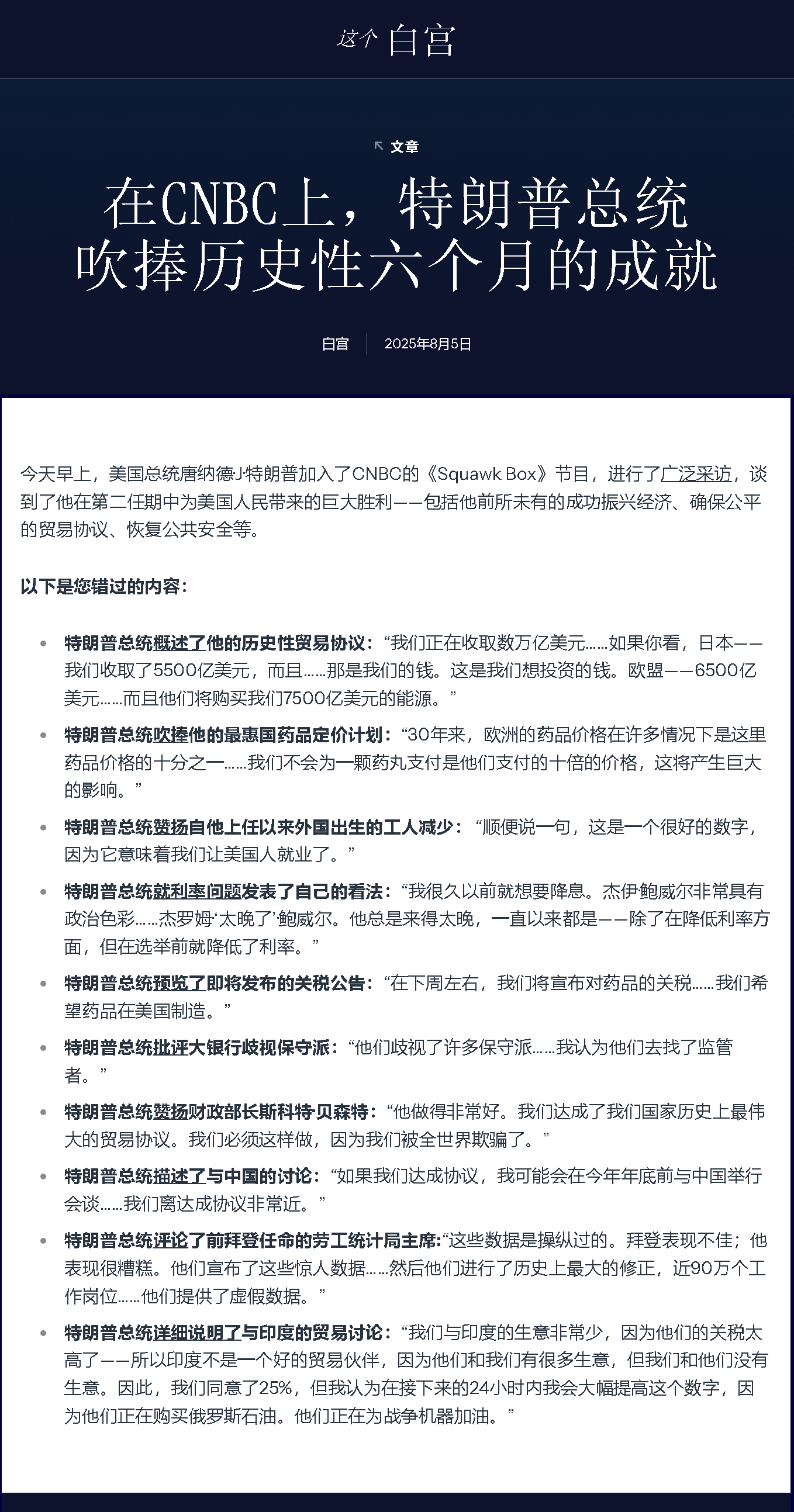 今天早上,美國總統(tǒng)唐納德·J·特朗普加入了CNBC的《Squawk Box》節(jié)目,進(jìn)行了廣泛采訪,談到了他在第二任期中為美國人民帶來的巨大勝利——包括他前所未有的成功振興經(jīng)濟(jì)、確保公平的貿(mào)易協(xié)議、恢復(fù)公共安全等。