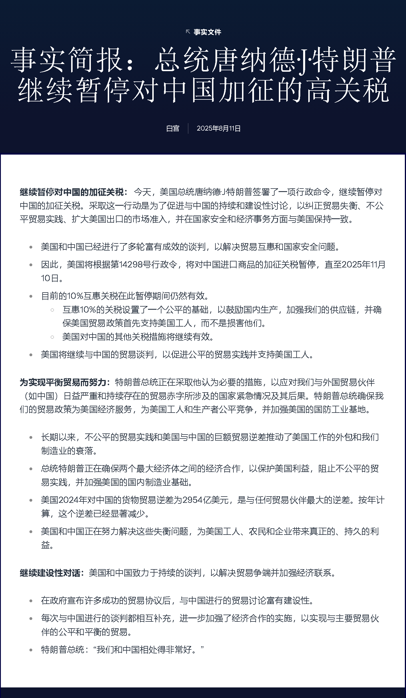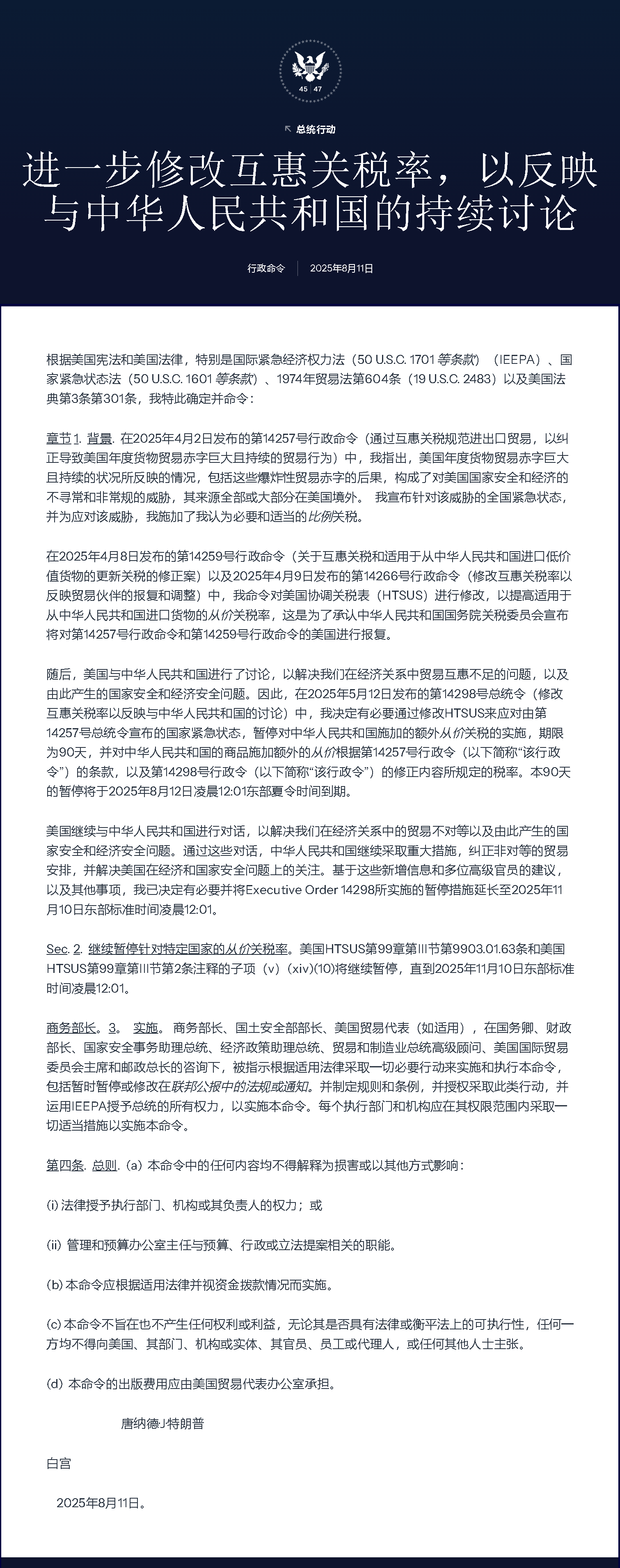 美國(guó)繼續(xù)與中華人民共和國(guó)進(jìn)行對(duì)話,以解決我們?cè)诮?jīng)濟(jì)關(guān)系中的貿(mào)易互惠性不足問題,以及由此產(chǎn)生的國(guó)家安全和經(jīng)濟(jì)安全問題。通過這些對(duì)話,中華人民共和國(guó)繼續(xù)采取重大措施,糾正非互惠貿(mào)易安排,并解決美國(guó)在經(jīng)濟(jì)和國(guó)家安全問題上的關(guān)切。基于這些新增信息和來(lái)自多位高級(jí)官員的建議,以及其他事項(xiàng),我已決定有必要并將Executive Order 14298所實(shí)施的暫停措施延長(zhǎng)至2025年11月10日東部標(biāo)準(zhǔn)時(shí)間凌晨12:01。