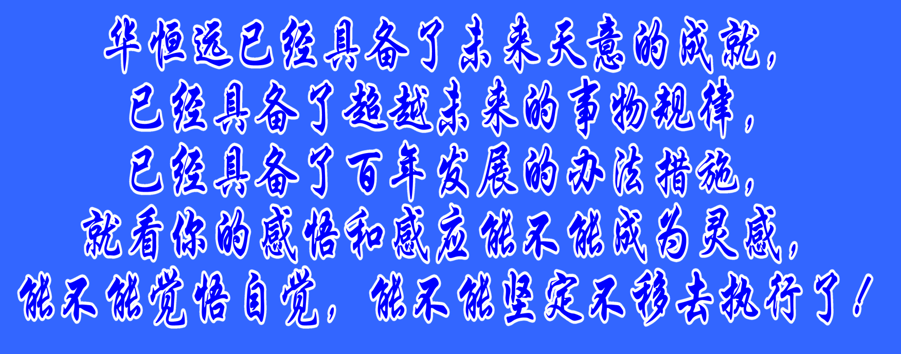 華恒遠(yuǎn)已經(jīng)具備了未來天意的成就,已經(jīng)具備了超越未來的事物規(guī)律,已經(jīng)具備了百年發(fā)展的辦法措施,就看你的感悟和感應(yīng)能不能成為靈感,能不能覺悟自覺,能不能堅(jiān)定不移去執(zhí)行了!