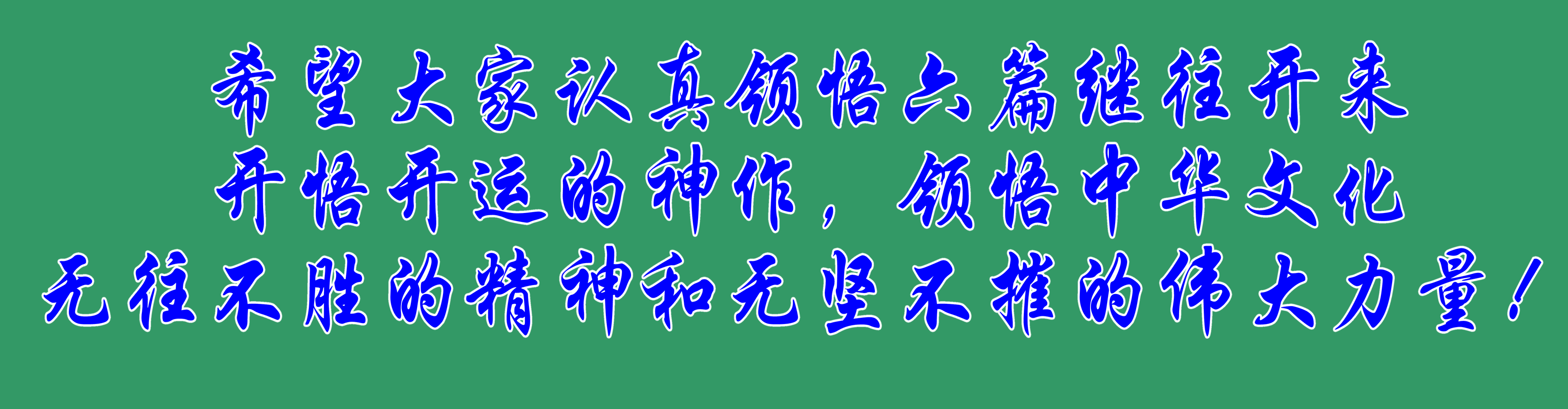 希望大家認(rèn)真領(lǐng)悟六篇繼往開來開悟開運(yùn)的神作,領(lǐng)悟中華文化無往不勝的精神和無堅不摧的偉大力量!