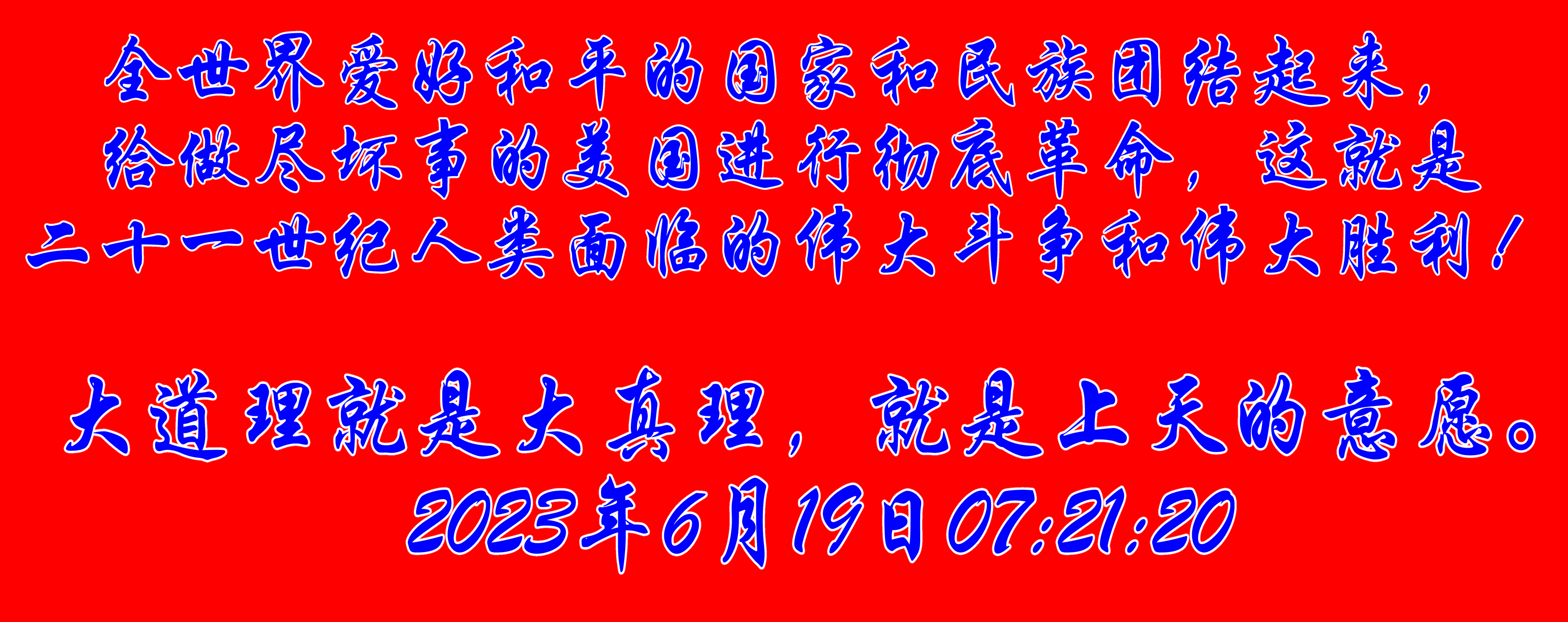 近百年世界和人類歷史 告訴我們,只有美國資本主義滅亡,世界才能安寧,人類才有希望,這是世界給我們和人類進(jìn)步的必答題,而這道題,需要全世界愛好和平的國家和民族團(tuán)結(jié)起來,給做盡壞事的美國進(jìn)行徹底革命,這就是二十一世紀(jì)人類面臨的偉大斗爭和偉大勝利!