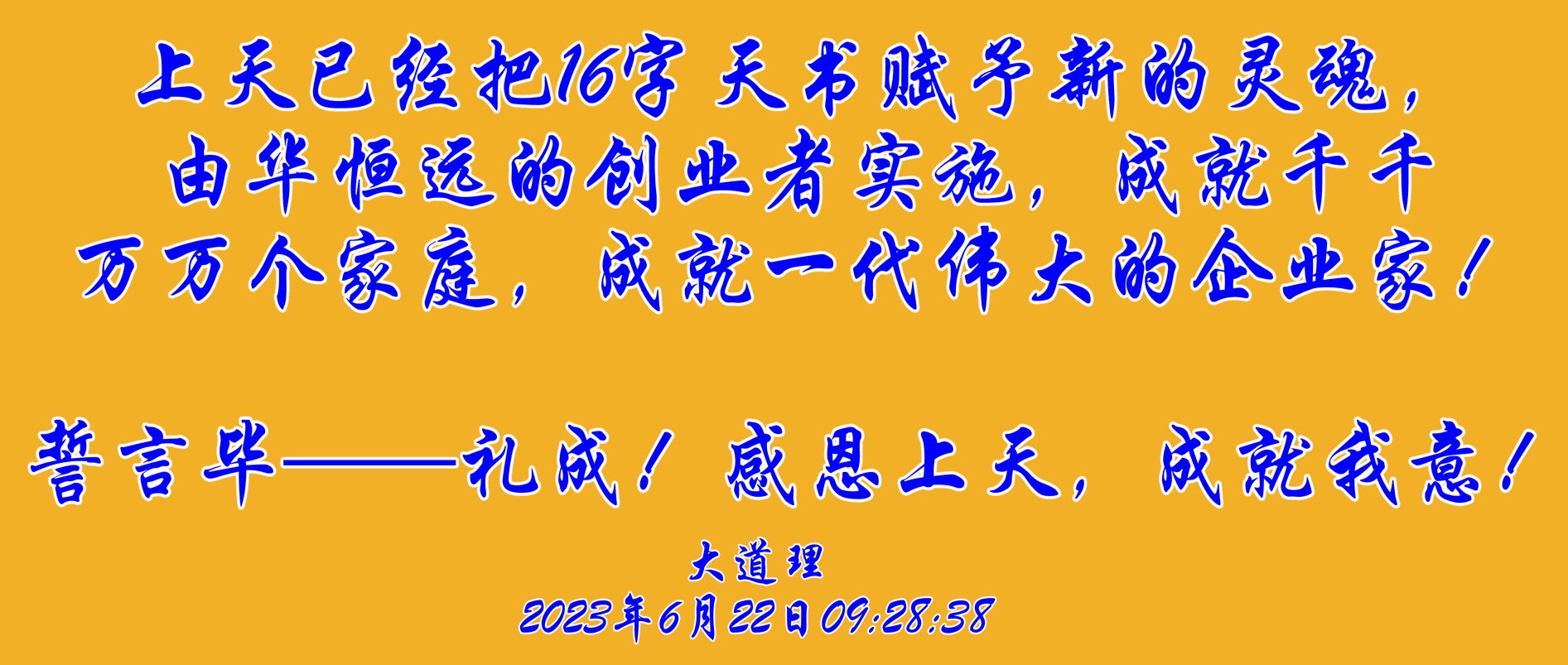 上天已經(jīng)把16字天書賦予新的靈魂,由華恒遠(yuǎn)的創(chuàng)業(yè)者實(shí)施,成就千千萬萬個(gè)家庭,成就一代偉大的企業(yè)家!