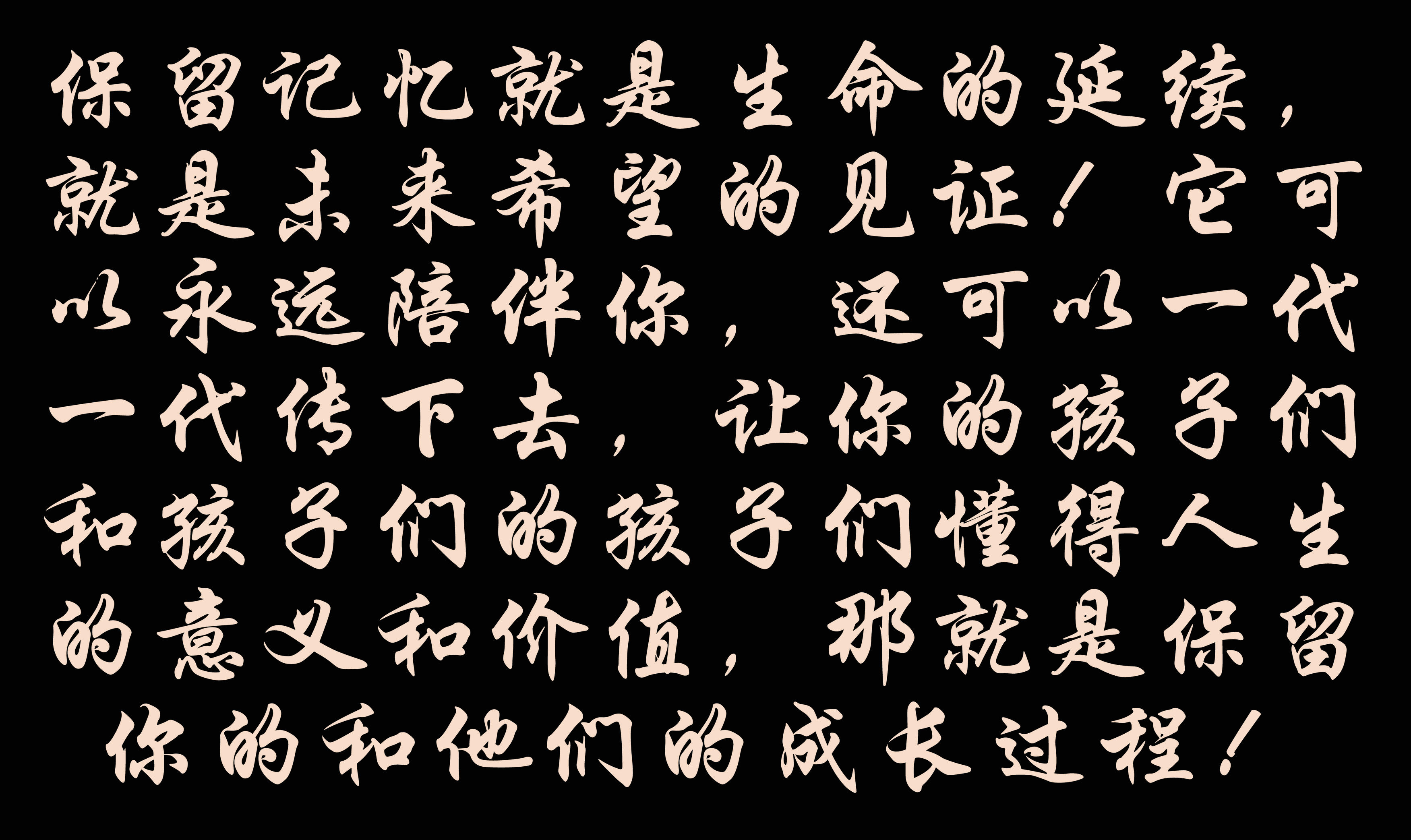 保留記憶就是生命的延續(xù),就是未來(lái)希望的見(jiàn)證!它可以永遠(yuǎn)陪伴你,還可以一代一代傳下去,讓你的孩子們和孩子們的孩子們懂得人生的意義和價(jià)值,那就是保留你的和他們的成長(zhǎng)過(guò)程!