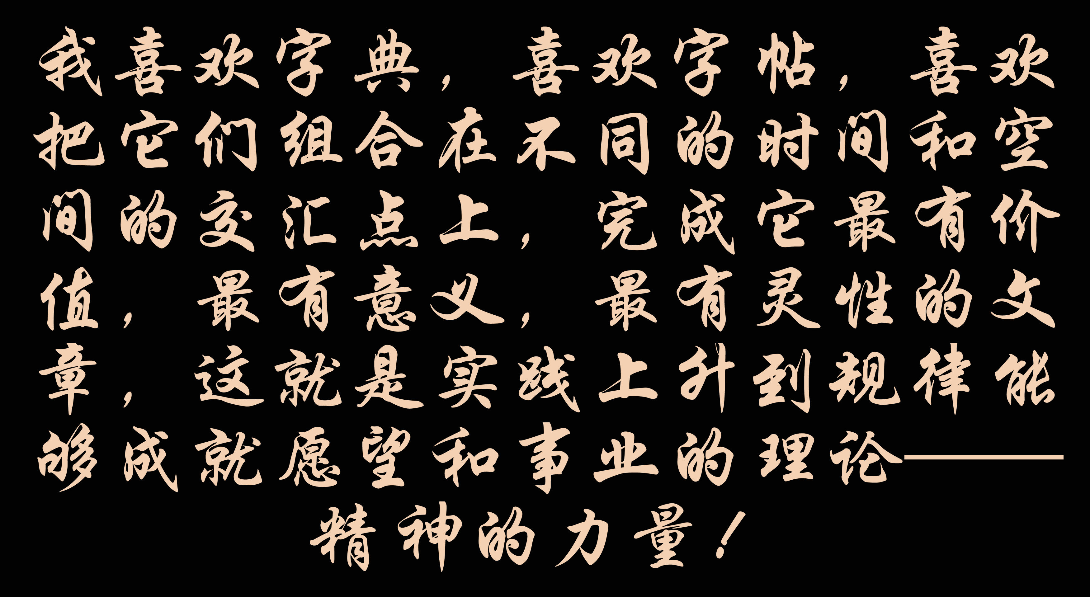 所以,我喜歡字典,喜歡字帖,喜歡把它們組合在不同的時間和空間的交匯點上,完成它最有價值,最有意義,最有靈性的文章,這就是實踐上升到規(guī)律能夠成就愿望和事業(yè)的理論——精神的力量!