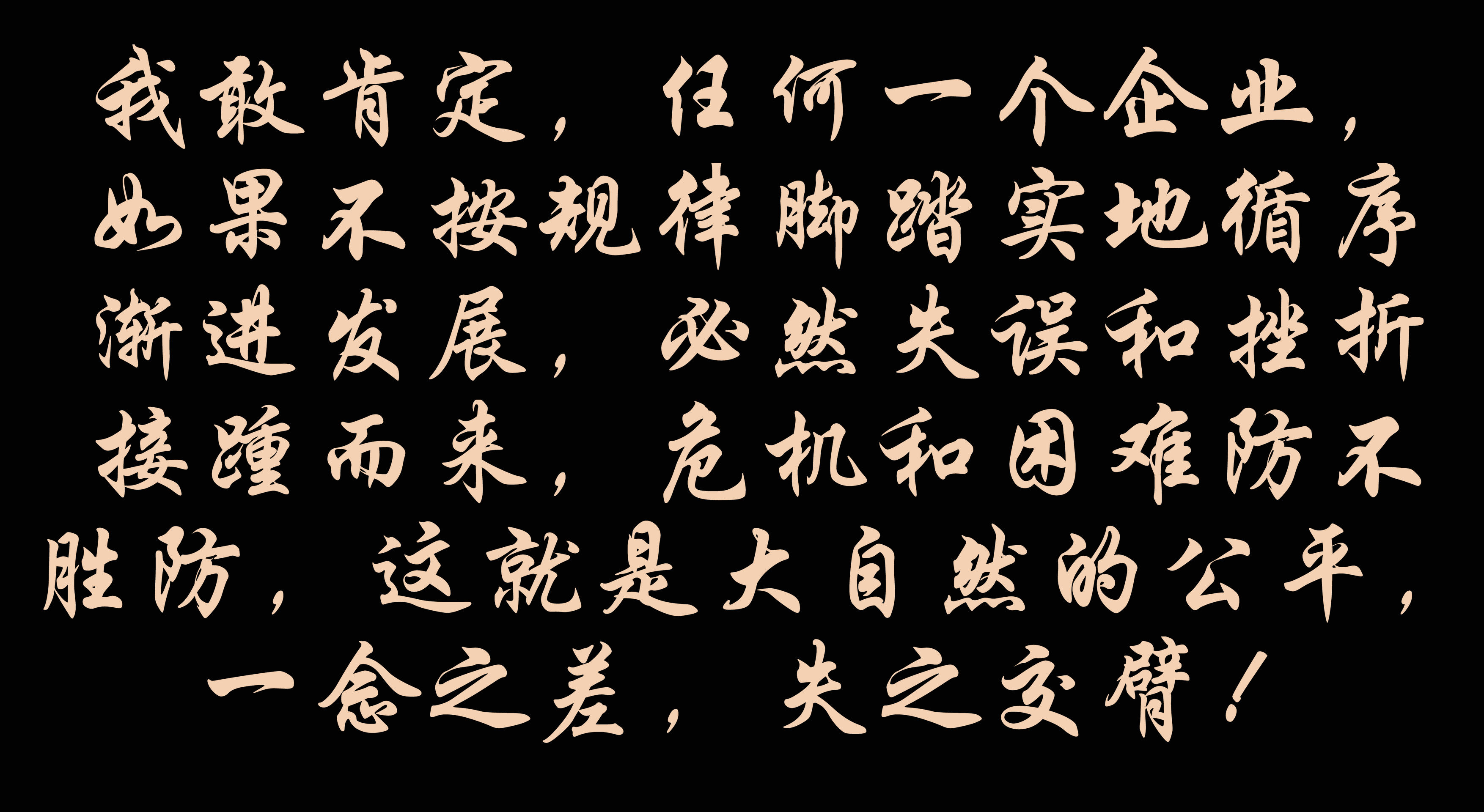 我敢肯定,任何一個(gè)企業(yè),如果不按規(guī)律腳踏實(shí)地循序漸進(jìn)發(fā)展,必然失誤和挫折接踵而來(lái),危機(jī)和困難防不勝防,這就是大自然的公平,一念之差,失之交臂!耽誤了你的寶貴時(shí)間和機(jī)遇,可惜了!