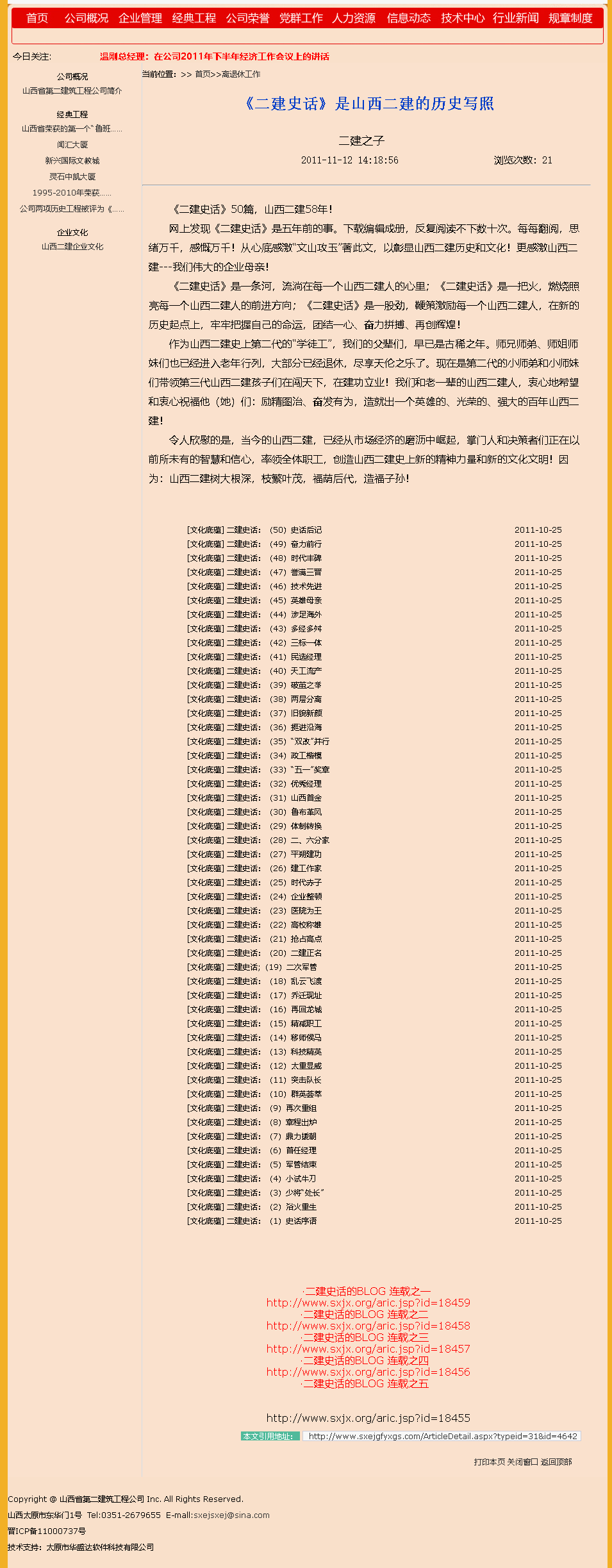 這是2009年9月15日首次在山西省建筑業(yè)協會網站全文轉發(fā)張文玉同志所撰《二建史話》五十篇。